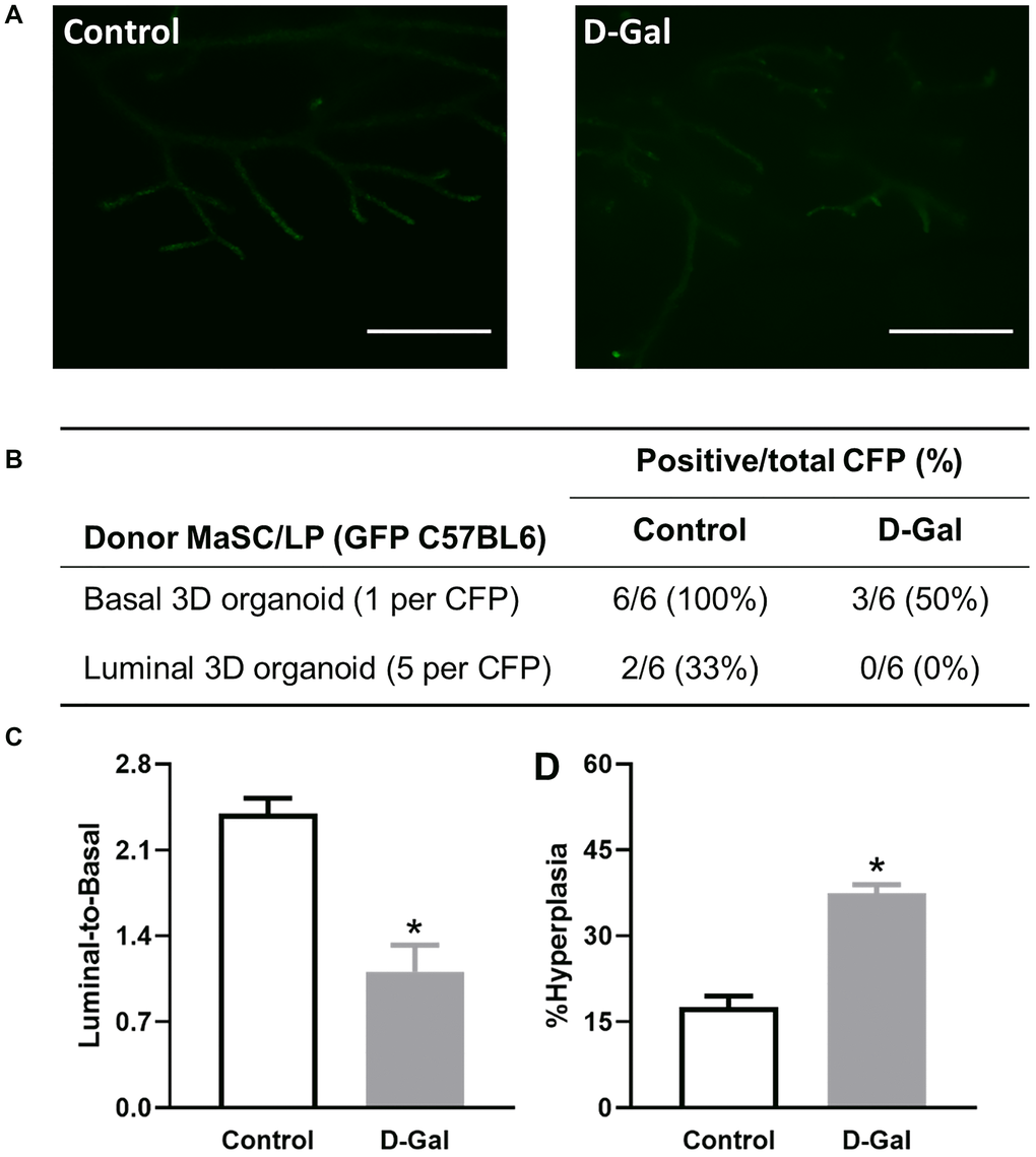 We further assessed stem cell self-renewal and differentiation by the cleared fat pad (CFP) transplant assay. Transgenic GFP C57BL/6 mice were treated with control or D-galactose, and MaSCs and LPs were subsequently isolated as donors for in vivo transplant. We have previously shown that 3D organoids contain stem cells that can repopulate CFP [23]. Thus, 3D organoids were used for in vivo transplantation. Regenerated glands were clearly visible with the fluorescence microscope given their expression of GFP (Figure 6A). For MaSCs, upon transplant of one single 3D organoid per CFP, we obtained six positive outgrowths from six transplants in the control MaSCs, representing 100% engraftment frequency, but only three positive outgrowths (50% engraftment) in MaSCs derived from the D-galactose-treated mice (Figure 6B). For LPs, we injected five individual 3D organoids per CFP into six CFPs and obtained two positive outgrowths (33% engraftment) in the control LPs, but none in the D-galactose-treated LPs (Figure 6B). The regenerated glands were further harvested for flow cytometry analysis of the luminal-to-basal cell ratio as well as histopathological analysis. Our analysis showed a decreased luminal-to-basal ratio of regenerated glands from D-galactose-treated MaSCs (1.1 ± 0.2) when compared to those from control MaSCs (2.4 ± 0.1) (Figure 6C). Similar to primary mammary glands, regenerated mammary ducts formed by D-galactose-treated MaSCs also showed a higher proportion of hyperplastic ducts than those from control MaSCs (37.5 ± 1.5% vs. 17.6 ± 1.9%) (Figure 6C).