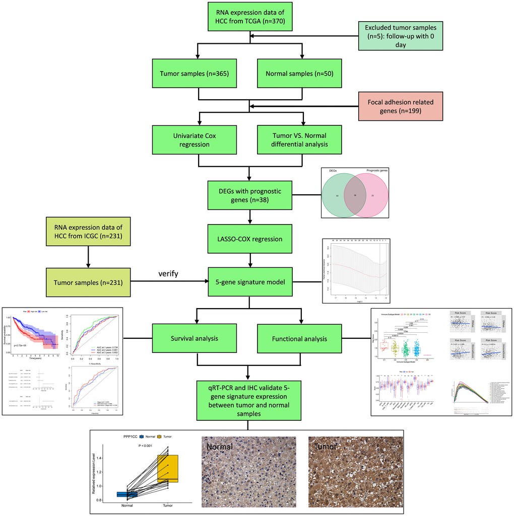 HCC is one of the most frequent cancer type worldwide [26]. Although multiple molecular mechanisms have been found to be involved in HCC progression [27], the underlying mechanism remains unclear. Our study provided a systematical analysis of the different expression of 199 focal adhesion related genes between HCC and adjacent non-tumorous tissues and their relationships with OS. Then, a 5-gene signature model was constructed by the LASSO algorithm. Both the internal and external validation cohorts demonstrated that the model worked stably and exhibited consistent predictive performance. More importantly, it could be used as an independent risk factor for predicting the prognosis of HCC patients.