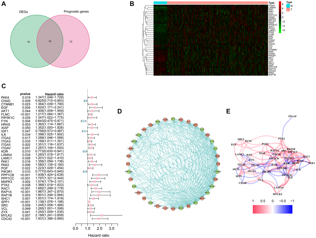 More than 50% of focal adhesion related genes (131/199, 65.8%) were identified as differentially expressed genes (DEGs) between the tumor and adjacent non-tumorous tissues using the "limma" R package, and Univariate Cox regression analysis showed that 38 of the 131 DEGs were correlated with overall survival (OS) (Figure 2A). As the expression level of ACTN3 was 0 in more than 80 samples, it was excluded from this analysis. Finally, 37 focal adhesion related DEGs were preserved (Figure 2B–2C). The protein-protein interaction network and correlation network between these DEGs are shown in Figure 2D–2E.