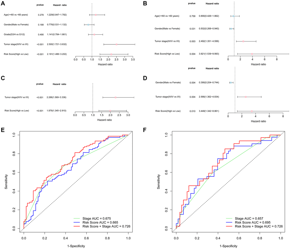 Univariate and multivariate Cox regression analyses were performed to confirm whether the risk score was independent of traditional clinicopathological characteristics for OS. Univariate Cox regression showed that the tumor stage (TCGA cohort: HR = 2.500, 95% CI = 1.721–3.363, P < 0.001; ICGC cohort: HR = 2.492, 95% CI = 1.351–4.599, P = 0.003) and the risk score (TCGA cohort: HR = 2.181, 95% CI = 1.486–3.202, P < 0.001; ICGC cohort: HR = 3.921, 95% CI = 1.539–9.993, P = 0.004) were independent factors for predicting the OS prognosis (Figure 4A–4B). With other confounding factors adjusted, the results were consistent with the above (Figure 4C–4D). Furthermore, the AUC of the risk score combined with the tumor stage at 3-year OS (TCGA set: AUC = 0.726; ICGC set: AUC = 0.726) demonstrated that the combined model worked the best for predicting OS (Figure 4E–4F).