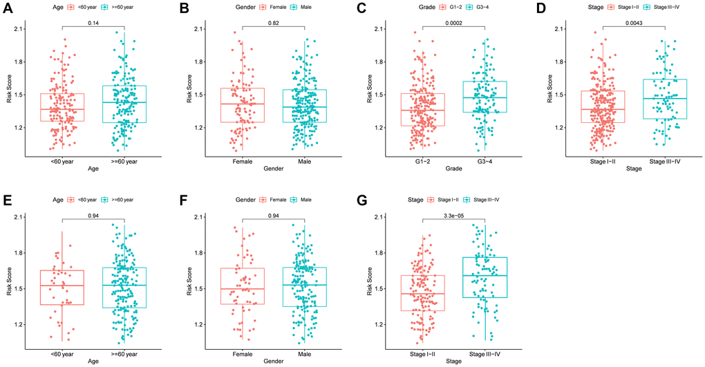 The correlation between the risk score and various clinical characteristics in HCC patients based on TCGA and ICGC data is indicated in Figure 5A–5G, respectively. Higher risk score was observed in patients with the higher tumor grades (P < 0.001) and more advanced tumor stage (P = 0.004) in the TCGA cohort. However, the risk score had no significant correlation with age and gender. The same analysis in the ICGC cohort showed the similar results (There were no data about the grade of LICH in the ICGC cohort). Further analysis of the correlation of the expression level of the prognostic genes with age, gender, tumor stage and tumor grade of HCC patients showed that the expression of FYN, PPP1CC, RAC1, and SPP1 was significantly correlated with the tumor grade (P < 0.05). In addition, the expression of PPP1BC, PPP1CC and RAC1 was correlated with the tumor stage (P < 0.05) (Supplementary Figure 4C–4D); the expression of PPP1CC and SPP1 was correlated with age (P < 0.05) (Supplementary Figure 4A); the expression of PPP1CB was correlated with gender (P < 0.05) (Supplementary Figure 4B).