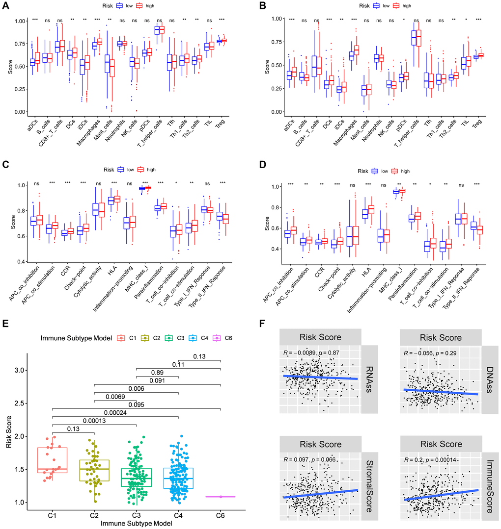 The infiltration level of immune cell score and stromal cell score was obtained by using the "estimate" R package. The immune score and stromal score associated with the risk score or prognostic model were analyzed by Spearman correlation. Stem-cell-like features with risk score or prognostic model were measured by tumor stemness features extracted from the TCGA tumor samples. Six immune subtypes were defined to measure immune infiltrates. In tumor immune response, differences in prognostic model risk scores between the immune infiltrate subtypes obtained from the TCGA-LIHC were calculated by ANOVA analysis.