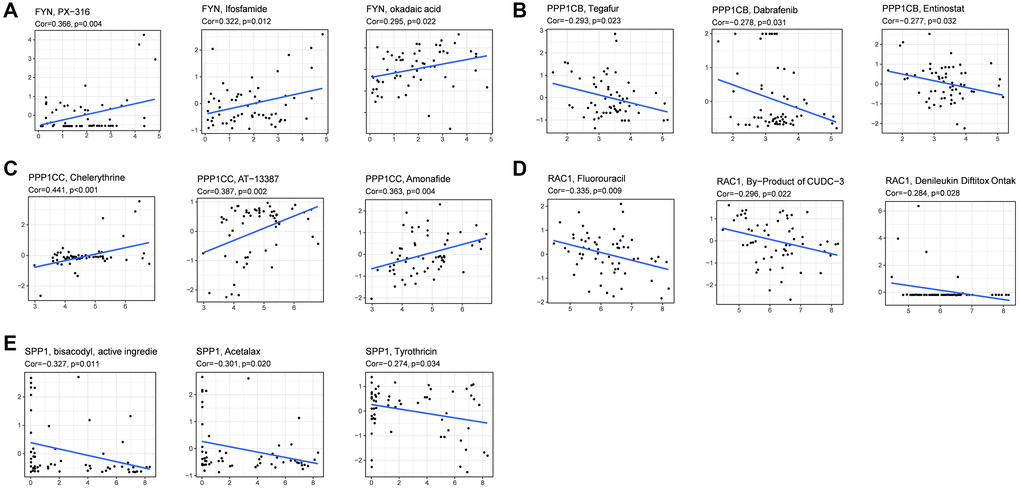 Then we investigated the association between focal adhesion related genes and chemotherapy sensitivity in the NCI-60 database. The results showed that all the prognostic genes were to some extent correlated with chemotherapy drug sensitivity (Figure 8, Supplementary Table 4). We also found that the increased expression of PPP1CB, RAC1, and SPP1 was correlated with increased drug resistance of cancer cells to several chemotherapy drugs, such as Tegafur, Dabrafenib, Entinostat, Fluorouracil, By-Product of CUDC-3, Denileukin Diftitox Ontak, Bisacofyl (active ingredient), Acetalax and Tyrothricin (cor > 0.27 and P < 0.05). Furthermore, increased PPP1CC and FYN expression was correlated with increased drug sensitivity to cancer cells, such as PX−316, Ifosfamide, okadaic acid, Chelerythrine, AT-13387, and Amonafide (cor > 0.29 and P < 0.05). These results demonstrate that the model could serve as a potential predictor for chemotherapy sensitivity.