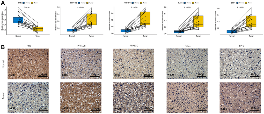 To validate the different expression of the five prognostic genes (FYN, PPP1CB, PPP1CC, RAC1, and SPP1) between HCC and adjacent non-tumorous tissues, real-time quantitative-polymerase chain reaction (qRT-PCR) and immunohistochemistry (IHC) were performed to analyze the mRNA and protein expression, respectively. As shown in Figure 9A, PPP1CB, PPP1CC, RAC1, and SPP1 were highly expressed in HCC tissues vs. adjacent non-tumorous tissues, while FYN was at a low level in HCC tissues. Immunohistochemical staining showed the same results (Figure 9B). The validation results were consistent with the RNA sequencing results of the five prognostic genes in the TCGA cohort (Supplementary Figure 3).
