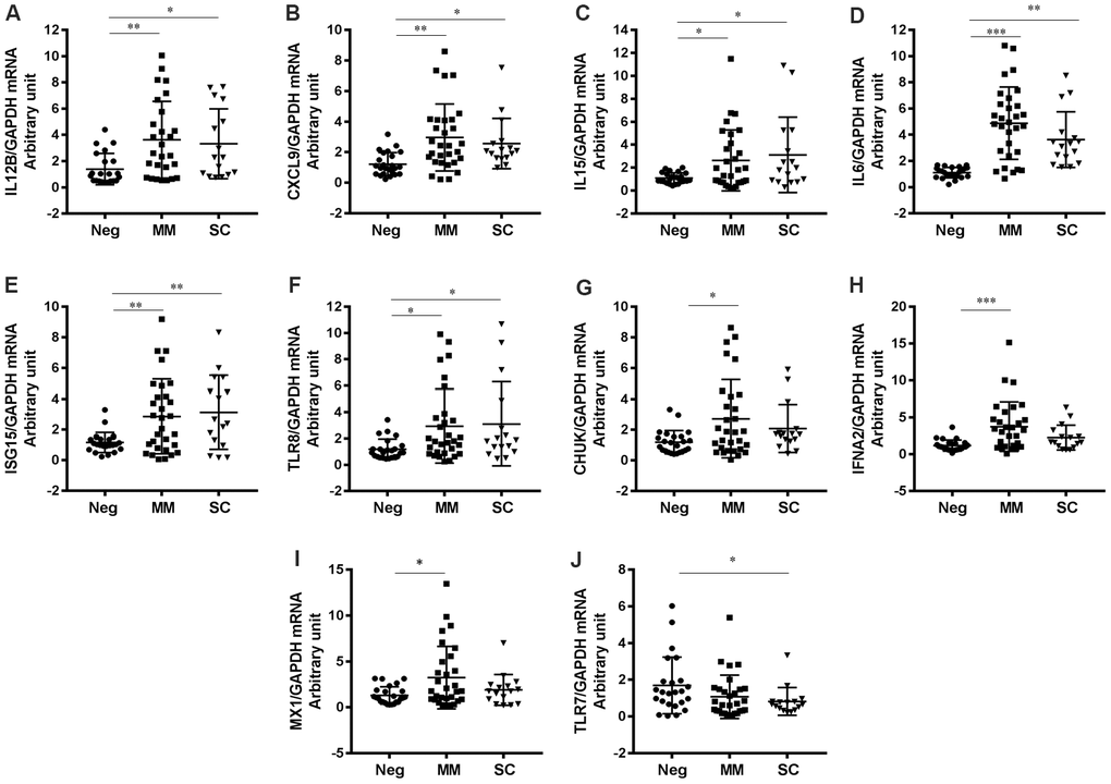 Host cytokine perturbations have been observed in COVID-19 patients, particularly in SARS-CoV-2-induced cytokine storm syndrome (CSS), which is associated with disease severity [6, 7, 26]. The overactive immune response and nonspecific, disseminated cytokine release, including interleukin-6 (IL-6), in severe cases of COVID-19 may lead to organ failure [36]. Moreover, the combination of several cytokine levels has been used to predict COVID-19 severity and recovery [37]. IL-6 (proinflammatory) and IL-10 (anti-inflammatory) are two cytokines commonly dysregulated in COVID-19 patients and the ratio of IL6-to-IL10 may be used to predict outcomes of COVID-19 patients [37–39]. This new scoring system has been reported to help clinicians predict COVID-19 patients at risk for severe disease and those that require intervention [38]. We found that IL6 mRNA levels were significantly elevated in both MM and SC patients compared to negative controls. Our findings suggest that SARS-CoV-2 induces proinflammatory gene expression.