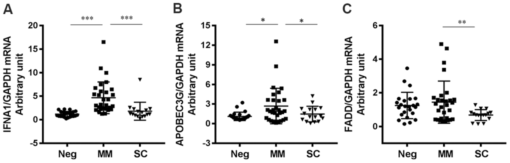We found that expression levels of interferon alpha 1 (IFNA1), apolipoprotein B mRNA editing enzyme, catalytic polypeptide-like 3G (APOBEC3G), and Fas-associated protein with death domain (FADD) were significantly lower (P < 0.05) in the SC group than in the MM group (Figure 2). Notably, IFNA1 are APOBEC3G are interferon-stimulated genes (ISGs); IFNA1 encodes IFNα, which plays a critical role in antiviral activities and APOBEC3G (part of the APOBEC superfamily of proteins) is believed to function in innate antiviral immunity [27]. In addition, we found that two additional IFN pathway genes, IFNA2 and MX1, were slightly downregulated in the SC group compared to the MM group. These results suggest that the IFN system is important in regulating COVID-19 progression. FADD is a key adaptor molecule involved in numerous physiological processes including mediating the extrinsic apoptotic pathway and regulating type I interferon signaling [28]. Of note, it has previously been reported that FADD was significantly reduced in HBV-infected patients [29].