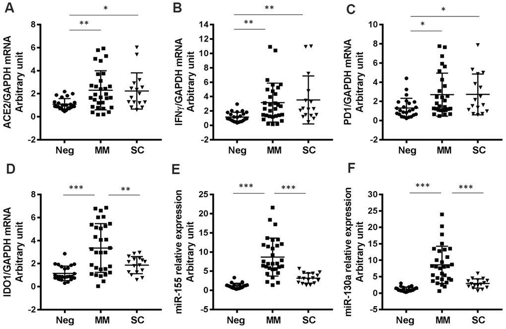We also evaluated genes that have been reported to regulate SARS-CoV-2 infection or host antiviral immunity. For example, expression of angiotensin-converting enzyme 2 (ACE2), which is the entry receptor for SARS-CoV-2, was substantially higher in both MM and SC groups than in the negative control group (Figure 4A). Furthermore, we found that IFNγ and PD-1 expression levels were significantly increased in all SARS-CoV-2-infected patients compared to negative controls (Figure 4B, 4C). Indoleamine 2,3-dioxygenase (IDO1) levels were higher in the MM group than in the control and severe groups (Figure 4D). The microRNAs, miR-155 and miR-130a have been reported to regulate viral infection by regulating the host immune response [30–32]. In this study, we found that both miR-155 and miR-130a were significantly upregulated in the MM disease group compared to the SC group (Figure 4E, 4F).
