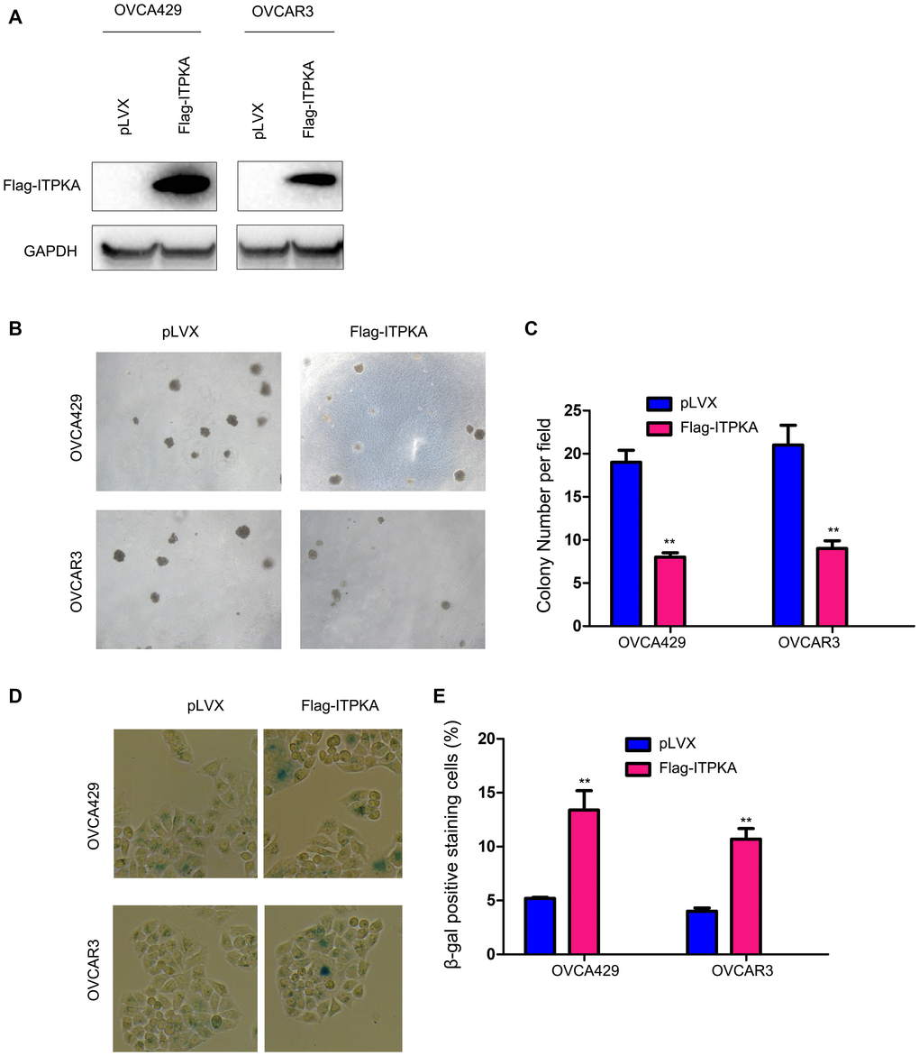 To investigate the functions of ITPKA in ovarian cancer, we transfected the ovarian cancer cell lines OVCA429 and OVCAR3 with a vector (Flag-ITPKA) to overexpress ITPKA (Figure 1A). The effects of ITPKA expression on colony formation were examined using a soft agar assay. As shown in Figure 1B–1C, forced expression of ITPKA inhibited the anchorage-independent growth of OVCA429 and OVCAR3 cells on soft agar. Moreover, β-gal staining revealed that ITPKA induced cell senescence (Figure 1D–1E).