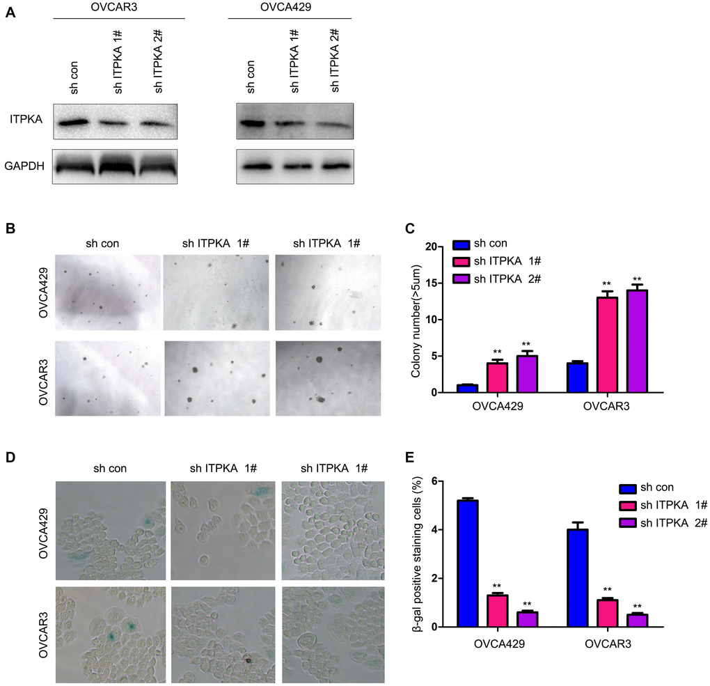 To further understand the functions of ITPKA in the progression of ovarian cancer, the expression of ITPKA was knocked down in OVCA429 and OVCAR3 cells (Figure 2A). Knockdown of ITPKA expression enhanced the anchorage-independent growth of ovarian cancer cells and inhibited cell senescence (Figure 2B–2E). Taken together, these results demonstrated that ITPKA inhibited the colony formation of cancer cells and induced cell senescence.