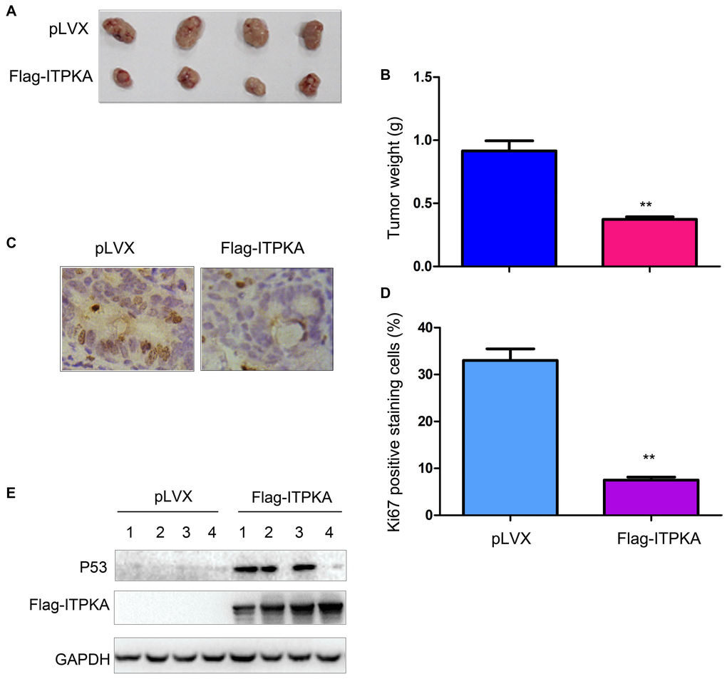 To extend our study to an in vivo system, we injected OVCAR3 control cells (OVCAR3/pLVX) and ITPKA-overexpressing cells (OVCAR3/Flag-ITPKA) into nude mice. Consistent with the in vitro study, overexpression of ITPKA impaired the tumorigenicity of OVCAR3 cells, as demonstrated by the tumor weight values (Figure 3A–3B). Examination of the tumors using immunohistochemistry (IHC) for Ki67 revealed less Ki67 staining in the tumors formed by the OVCAR3/Flag-ITPKA cells (Figure 3C–3D) compared to that in the control cells, suggesting that ITPKA inhibited cell proliferation. Moreover, P53 protein levels were increased in the tumors formed by OVCAR3/Flag-ITPKA cells (Figure 3E).