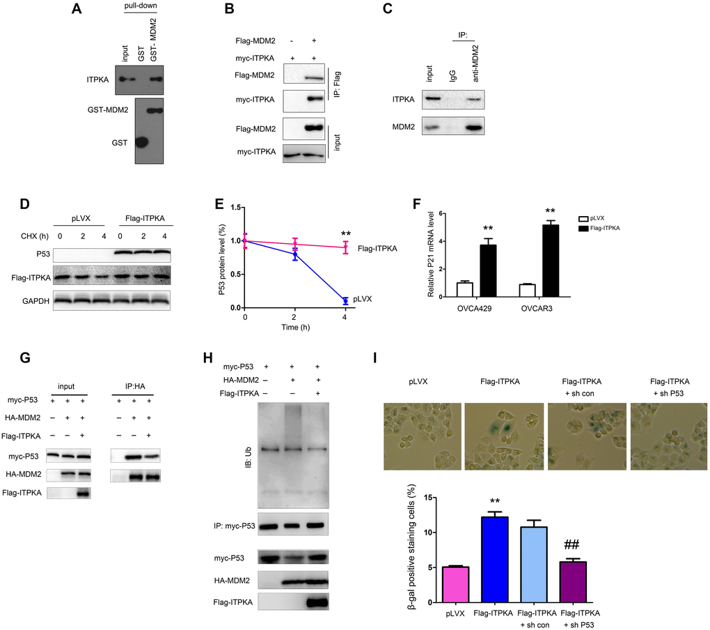 We next explored the molecular mechanisms through which ITPKA inhibited the tumorigenicity of ovarian cancer cells. Considering the induction of cell senescence by ITPKA, a GST pull-down assay was performed, and then the interactions between ITPKA and a major component of senescence-related pathways were examined. Interestingly, in the GST pull-down assay, the interaction between the fusion protein GST-MDM2 and ITPKA was detected (Figure 4A), which was further demonstrated by an immunoprecipitation assay (Figure 4B–4C). Next, the effects of ITPKA on the stability of P53 were assessed. ITPKA induced the accumulation of P53 upon CHX treatment as well as the expression of P21, the downstream target of P53 (Figure 4D–4F). Therefore, ITPKA interacted with MDM2 and stabilized P53 to inhibit cell growth and induce senescence.