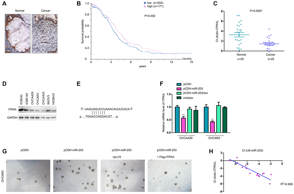 In a previous study, we demonstrated that miR-203 is upregulated in ovarian cancer. Therefore, we tested whether miR-203 inhibited the expression of ITPKA. As shown in Figure 5E–5F, miR-203 negatively regulated the mRNA level of ITPKA in OVCA429 and OVCAR3 cells (Figure 5E–5F). Moreover, the ability of miR-203 to promote colony formation of OVCAR3 cells was abolished by ITPKA (Figure 5G). In addition, we found a negative association between the expression of miR-203 and the mRNA levels of ITPKA (Figure 5H). In summary, ITPKA was downregulated in ovarian cancer and negatively regulated by miR-203.