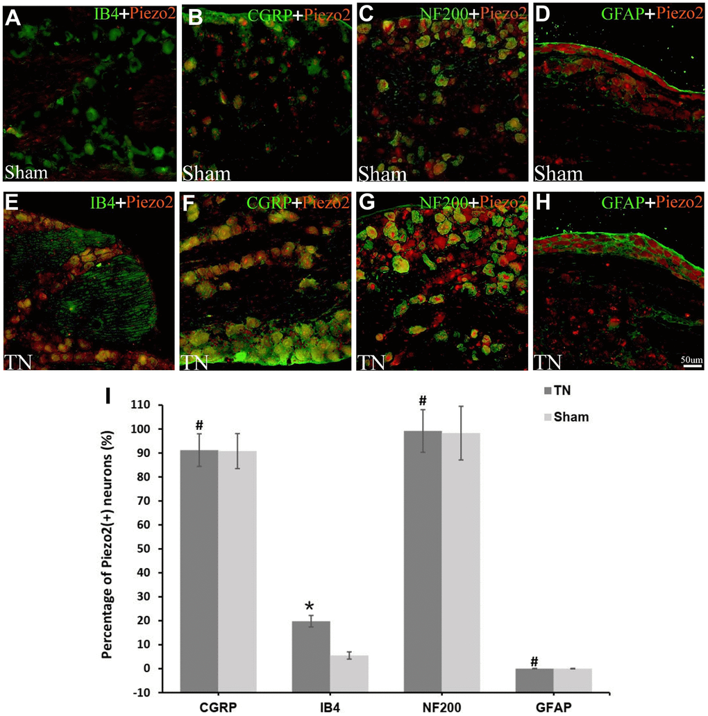 Apart from that in the DRG neurons, recent studies have shown that Piezo2 mediates mechanical transduction in dental primary afferent (DPA) neurons, especially in neurons that contain CGRP. As the CGRP is a biomarker of pain conducting, we consequently inferred that the Piezo2 might play a role in the allodynia of TN [18–20]. Previous study also showed that Piezo2 contributes to nociception by Aδ-mechanoreceptors in noninflamed corneas [21].