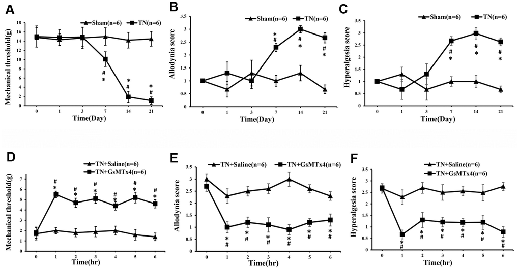 To assess the effect of Piezo2 on the innocuous touch and pain, 270 ug/kg GsMTx4 (inhibitor of mechano- gated Piezo channels) was injected intraperitoneally in the TN model rats and the effect was examined every hour. It was found that the mechanical threshold increased significantly in the first hour and remained at a high level in the next hours compared to those with intraperitoneal injection of normal saline. Likewise, the dynamic allodynia and pinprick hyperalgesia scores decreased correspondingly (Figure 3).