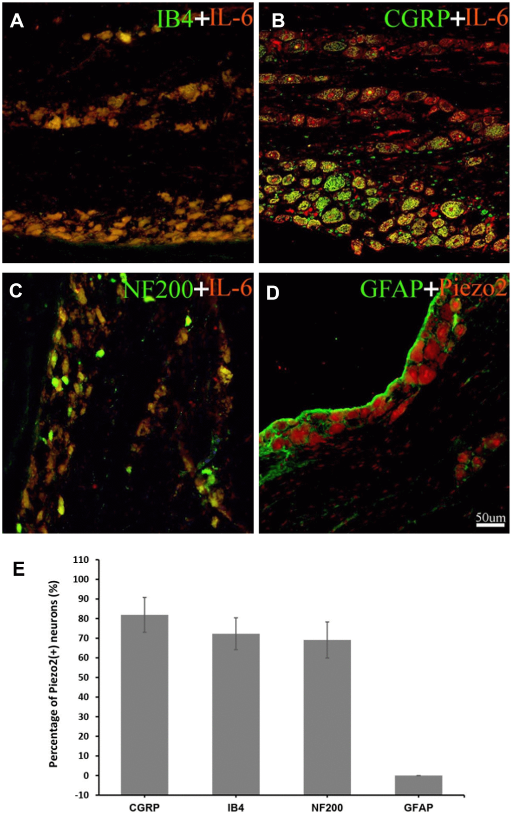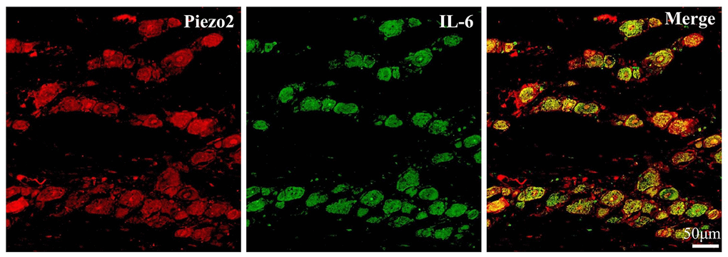 To determine the connection between Piezo2 and IL-6 expressions after chronic contraction injury of the trigeminal nerve, double immunofluorescence staining was performed. The results showed the Piezo2 positive accounted for 72.3±9.5% in those IL-6 positive neurons (Figure 6).
