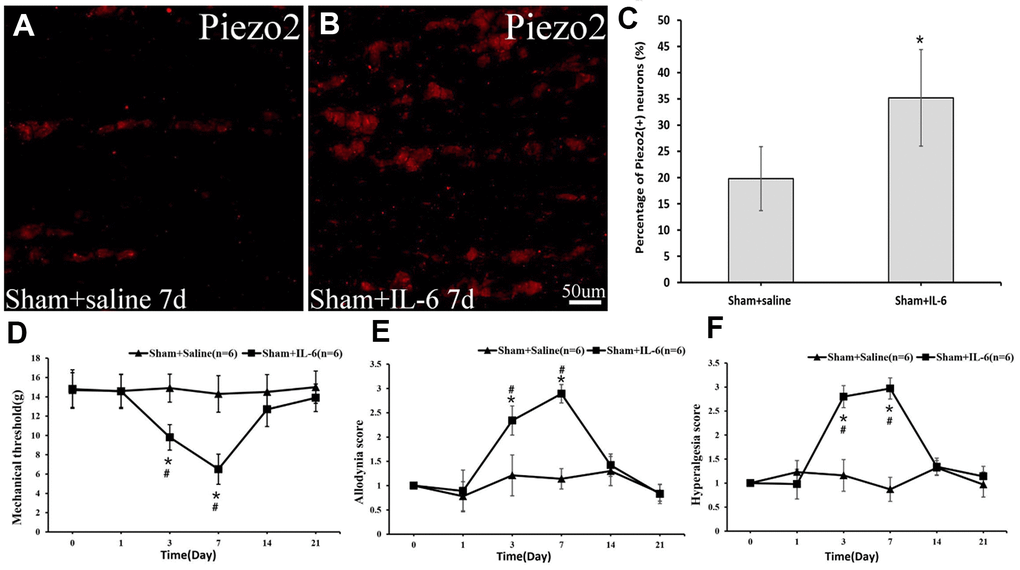 To positively prove the effect of IL-6 on Piezo2 as well as on pain, recombinant rat IL-6 was administrated locally in those with sham operations. Postoperatively, a significant increase in Piezo2 was displayed while the dynamic allodynia and pinprick hyperalgesia scores as well as the mechanical threshold changed significantly (Figure 8).