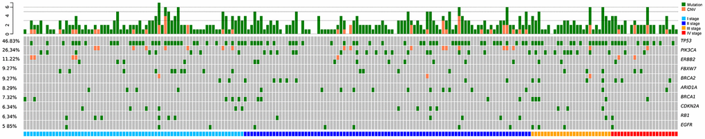 Next, matched DMI-tagged cell-free DNA (cfDNA) was sequenced using the Omigen 101 genes panel kit at a targeted sequencing depth of 40,000×–50,000×. The mutation profile was derived from 205 detected female Chinese patients’ cfDNA with an overall mutation detection rate of 94.15% (193/205; Figure 2). The allele fraction (AF) detected in our cohort ranged from 0.05%–32.48%. Some of these mutations were actionable, including SNVs, such as PIK3CA p.H1047L, p.E545K, and p.E542K, BRCA1/2 loss-of-function oncogenic mutation, and copy number mutations, such as ERBB2 amplification. No mutation was detected from the panel of the remaining 12 patients. Moreover, the patients with negative cfDNA tests were primarily in stage I or II of disease, including six patients in stage I and four in stage II (Figure 2).