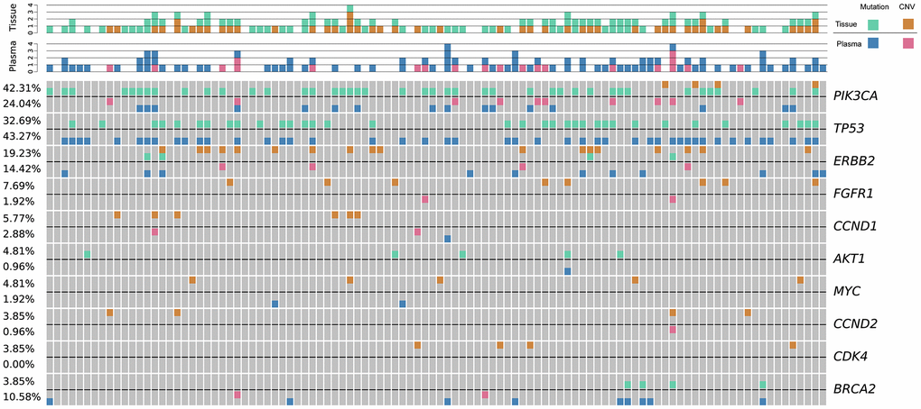 High-frequency molecular variants were analyzed in pairs of tumor tissue and plasma. The consistency, defined as harboring at least one common gene mutation site, was evaluated between the tumor tissue and paired plasma samples. The consistency values between tissue and plasma samples in stage I, II, III, and IV breast cancers were 80% (32/40), 80% (36/45), 100% (13/13), and 100% (3/3), respectively. The top three most prevalent mutated genes were as follows: PIK3CA (tissue: 42.31%, plasma: 24.04%), TP53 (tissue: 32.69%, plasma: 43.27%), and ERBB2 (tissue: 19.23%, plasma: 14.42%). The top three variants were PIK3CA p.H1047R (c.3140A>G), PIK3CA p.E545K (c.1633G>A), and PIK3CA p.E542K (c.1624G>A) (Figure 1). Our findings were consistent with those reported by Andre et al [20].