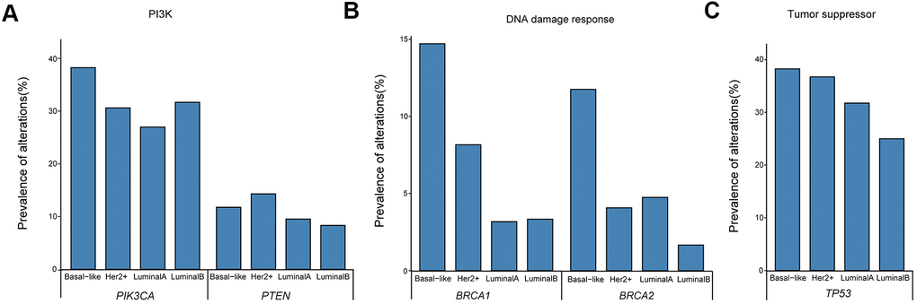 The distribution of mutations in patients was further analyzed based on four molecular subtypes. The prevalence of changes in cancer-related genes/pathways was compatible with that reported in previous studies of treated advanced breast malignancies, including frequent oncogenic mutations in the PI3K pathway and loss-of-function mutations in the DNA damage response and tumor suppressor pathways [21, 22]. Frequently varied genes in all four molecular subtypes are presented in Figure 3. The PIK3CA detection rates in basal-like (38.24%, 13/34) were higher than in luminal B (31.67, 19/60), HER2+ (30.61%, 15/49), and luminal A (26.98 %, 17/63) breast cancers (Figure 3A). Meanwhile, PTEN mutations were more frequently detected in HER2+ and basal-like subtypes and were less common in the luminal type, with detection rates of 14.29% (7/49), 11.76% (4/34), 9.52% (6/63), and 8.33% (5/60), respectively (Figure 3A). BRCA1/2 mutations were predominantly detected in basal-like patients (14.71%, 11.76%; Figure 3B), while TP53 mutations were frequently detected in all four molecular subtypes (38.24%, 36.73%, 31.75%, and 25% for basal-like, HER2+, luminal A, and luminal B, respectively; Figure 3C).