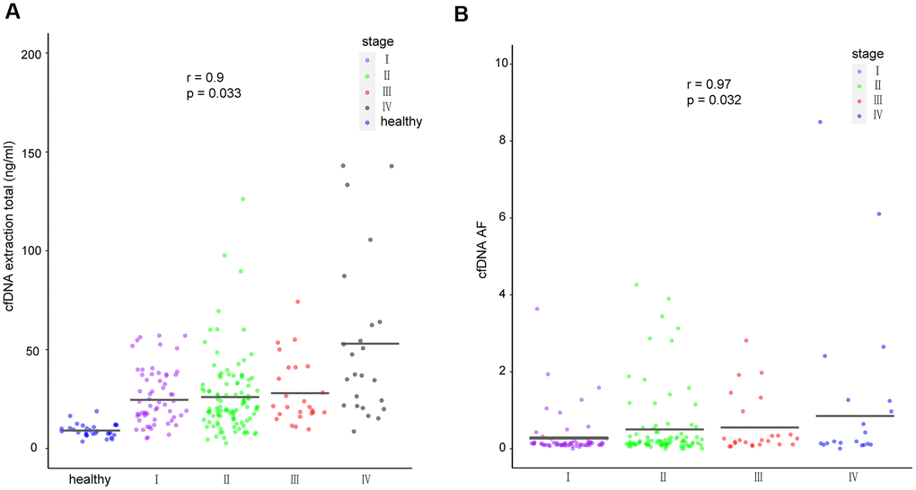 To investigate the correlations between cfDNA and corresponding clinical characteristics, we analyzed cfDNA yield in healthy participants and breast cancer patients with different disease stages. Considering that tumors generate a certain amount of free nucleotides into the peripheral blood, the cfDNA yield could represent the amount of released tumor DNA in the patient’s body [23, 24]. We found that cfDNA was significantly associated with disease stage (p = 0.033, r = 0.9; Figure 4A). Meanwhile, ctF, defined as the highest cfDNA allele frequency in patients with multiple alterations, was found to be significantly associated with disease stage (p = 0.032, r = 0.97; Figure 4B).