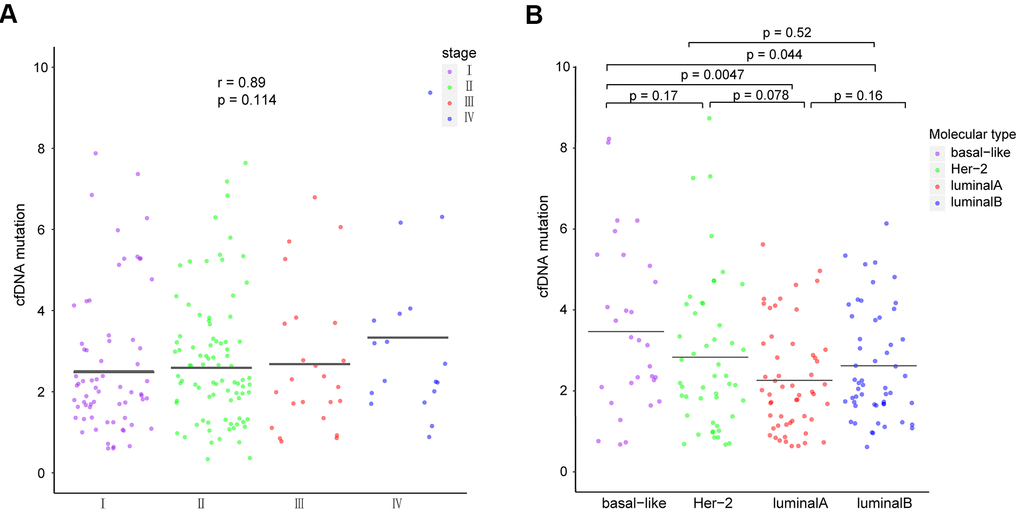 Number of ctDNA mutations in different molecular subtypes and disease stages