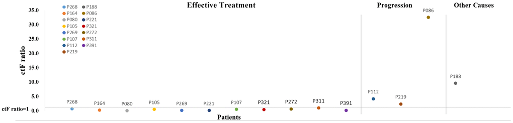 Eleven patients presented with decreased ctF ratio (ctF ratio: ctF2/ctF1, ctF1 refers to the highest AF in the first test, and ctF2 refers to the highest AF in the second test) (Figure 6, Supplementary Table 4), which is consistent with their imaging findings: 10 patients had significantly shrunken tumor size, and 1 patient had no significant increase in tumor size. Meanwhile, four patients had increased ctF ratios during or after treatment, 3 of whom P112, P219, and P86, had metastasis or relapse. The remaining patient required continued follow-up and observation to determine the clinical outcome.