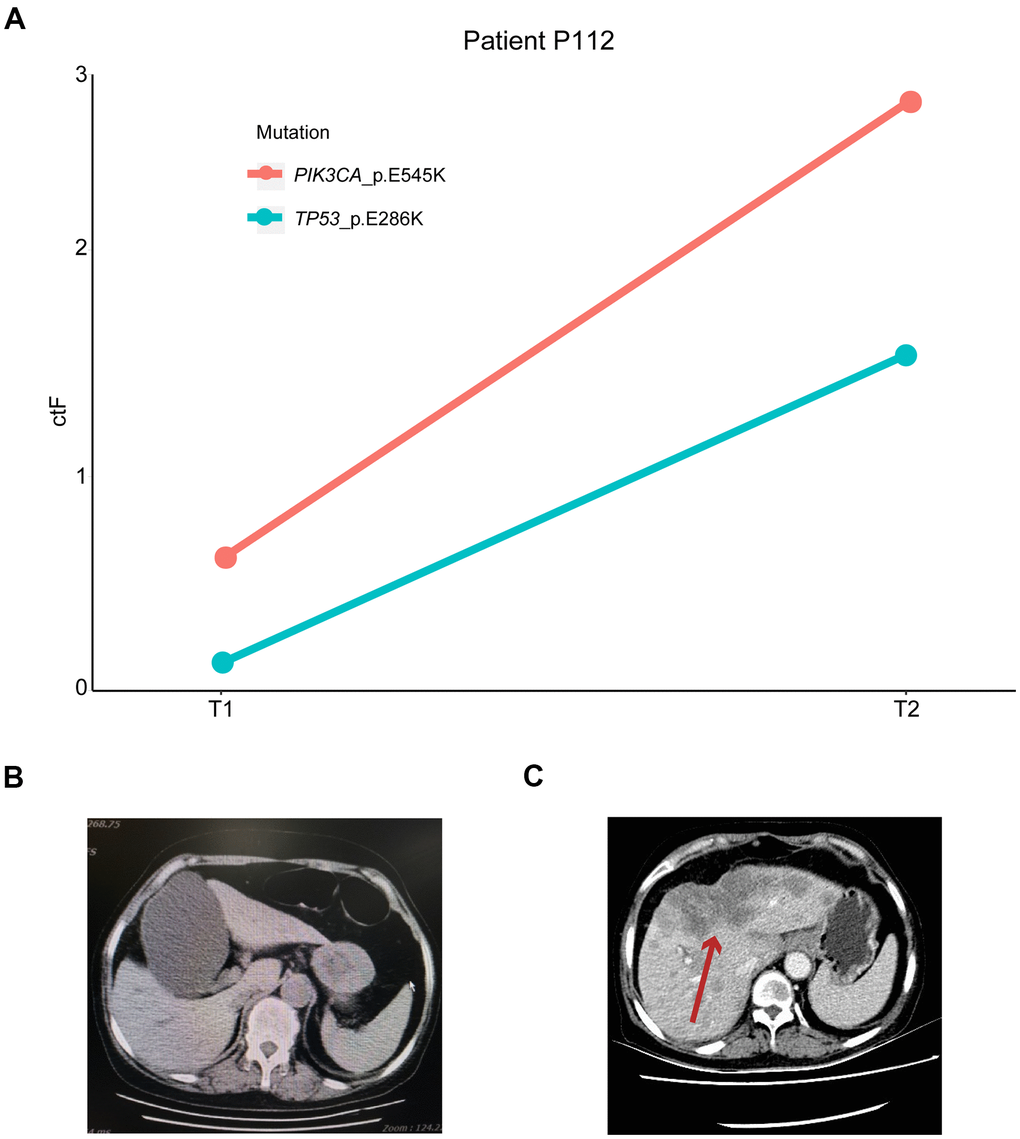 Patient P112 had locally advanced breast cancer, which was first diagnosed in December 2015, and received chemotherapy, endocrine therapy, and radiotherapy. The disease then progressed in March 2017 with liver metastasis. The first ctDNA detection (T1) was performed in April 2018, and postoperative lumbar spine metastasis occurred during treatment. The second detection (T2) was performed four months later when the disease had continuously progressed. Based on the patient’s genetic detection results, we recommended alpelisib plus fulvestrant treatment. We tracked the PIK3CA p.E545K and TP53 p.E286K mutations and found that their frequency increased from 0.64% and 0.18% to 2.65% and 1.54%, respectively (Figure 7). The change in ctDNA in the patient’s plasma was consistent with the clinical disease progression, resulting in a poor prognosis. A similar situation occurred in patient P219 with late-stage breast cancer, and the TP53 p.Y220C mutation increased from 0.16% to 0.97%, with a ctF ratio of 2.310. Additionally, patient p311 was diagnosed with HER2+ breast cancer and received neoadjuvant chemotherapy and target therapy. The patient presented with decreased ctF ratio and tumor size during mutation tracking and reached complete clinical response during surgery.