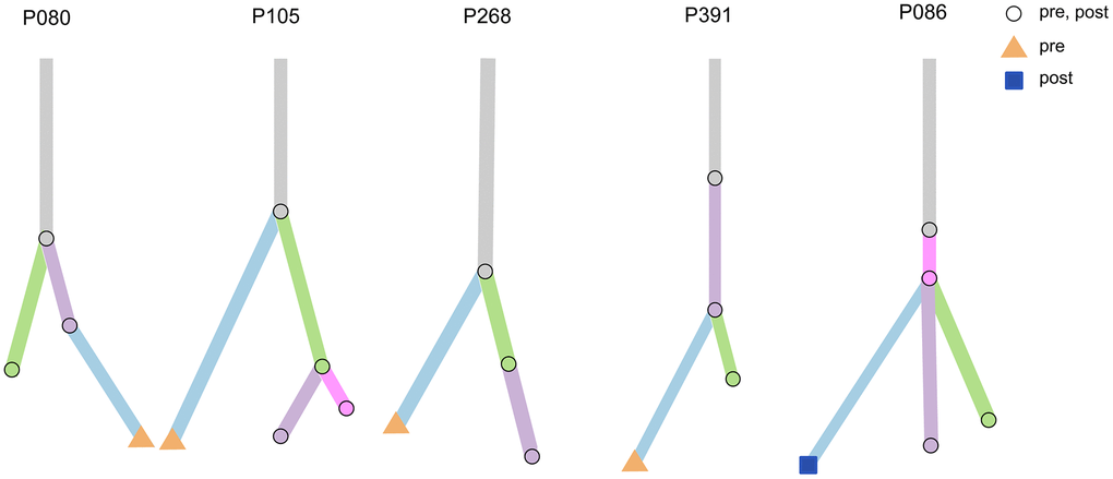 To further understand the molecular characteristics and clonal evolution in our study samples, clonal analysis was performed for several patients using mutation tracking data. Certain clones were undetectable following treatment in patients P080, P105, P268, and P391. Moreover, ctF values decreased after receiving treatment in these patients, suggesting a decreased tumor mutational burden or disappearance of specific clonal clusters resulting in a relatively better prognosis (Figure 8). However, new emerging clones were observed following treatment in patient P086.