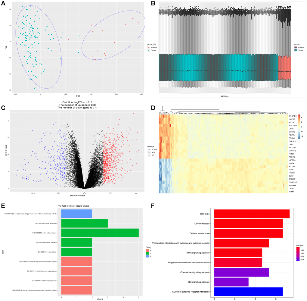 GSE62165, comprised of 118 PDAC and 13 normal control pancreatic samples, was used to identify the DEGs between PDAC and normal tissue. The dataset conformed to sample homogeneity and PCA analysis could clearly discriminate PDAC group from control group (Figure 1A–1B). A total of 909 DEGs were obtained in GSE62165 (the cut-off value of logFC is 1.816), among which 271 genes were down-regulated and 638 genes up-regulated (Figure 1C). The top 25 DEGs exhibited by heatmap were displayed in Figure 1D. We further analyzed the functional enrichment of the top 25 DEGs (Figure 1E–1F). GO analysis showed that cell skeleton components and protein phosphorylation events are closely related to their effect, and KEGG analysis indicates the involvement of pathways like cell cycle regulation, cellular senescence, PPAR signaling, P53 signaling, chemokine signaling and cytokine-cytokine receptor signaling pathway, which are all well-appreciated in tumor development. Therefore, this set of data is eligible for further investigation.