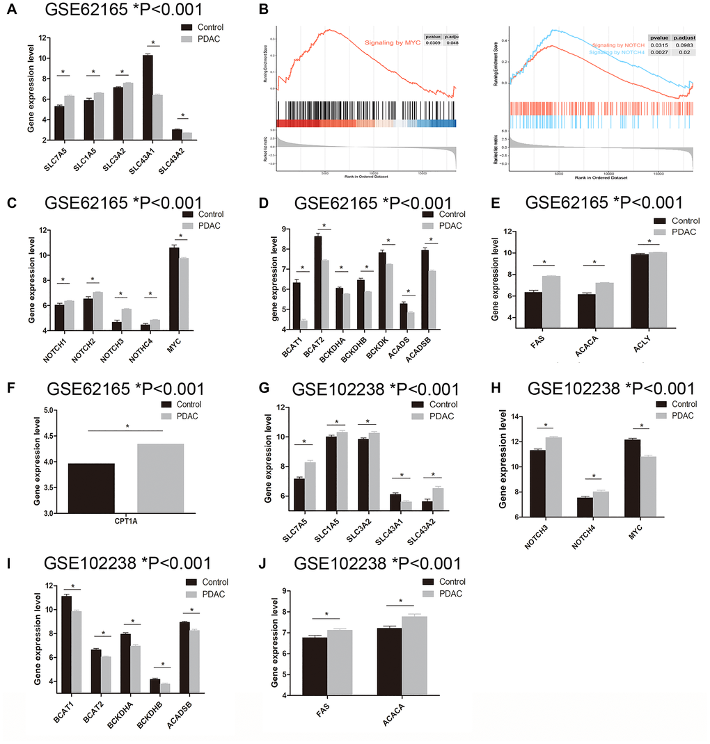 In order to validate our findings, we used GSE102238 dataset to confirm above results. GSE102238 contains 100 cases of paired PDAC tissue and the adjacent normal tissue. In PDAC tissue, gene expression level of SLC7A5 (8.269 ± 0.148 vs 7.154 ± 0.233, P < 0.001), SLC1A5 (10.320 ± 0.109 vs 10.010 ± 0.101, P = 0.040), SLC3A2 (10.260 ± 0.106 vs 9.846 ± 0.087, P = 0.003) and SLC43A2 (6.516 ± 0.144 vs 5.625 ± 0.167, P = 0.0001) are similarly up-regulated and SLC43A1 (5.607 ± 0.082 vs 6.105 ± 0.104, P < 0.001) is down-regulated (Figure 2G). Although gene expression data of NOTCH1 and NOTCH2 are absent from this dataset, we found that NOTCH3 (12.330 ± 0.081 vs 11.300 ± 0.110, P < 0.001) and NOTCH4 (8.018 ± 0.120 vs 7.539 ± 0.127, P = 0.007) expression level in PDAC tissue are upregulated while MYC (10.800 ± 0.114 vs 12.150 ± 0.126, P < 0.001) is down-regulated (Figure 2H). Gene expression level of BCAT1 (9.841 ± 0.122 vs 11.11 ± 0.170, P < 0.001), BCAT2 (6.051 ± 0.065 vs 6.643 ± 0.107, P < 0.001), BCKDHA (6.955 ± 0.119 vs 7.944 ± 0.131, P < 0.001), BCKDHB (3.777 ± 0.074 vs 4.166 ± 0.096, P < 0.001) and ACADSB (8.257 ± 0.095 vs 8.933 ± 0.086, P < 0.001) are decreased in PDAC tissue (Figure 2I). And for lipogenesis related genes, FAS (7.118 ± 0.081 vs 6.763 ± 0.105, P = 0.009) and ACACA (7.779 ± 0.120 vs 7.214 ± 0.109, P < 0.001) are increased in PDAC tissue (Figure 2J). Unfortunately, the expression data of CPT1A is absent from this dataset. Nevertheless, the comparative results between PDAC tissue and adjacent tissue corroborate the findings obtained from PDAC and normal tissue samples.