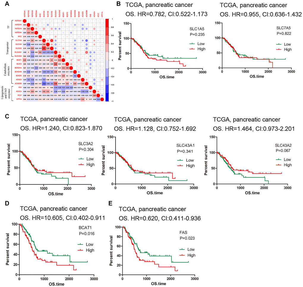 To further understand the relationship between BCAA catabolism and fatty acid biosynthesis/oxidation, correlation analysis was conducted. ACACA gene expression is in moderate negative correlation with ACADS and ACADSB expression (r = -0.383, r = -0.344) and FAS was in moderate negative correlation with BCAT1 and BCAT2 (r = -0.305, r = -0.348) (Figure 3A). The rest of genes displays no obvious correlation; thus, contrary to what has been anticipated, there does not exist a positive link between BCAA catabolism and lipid biosynthesis. Finally, we used the pancreatic cancer dataset in TCGA for survival analysis. We first check the BCAA carriers. Although none of them reached statistic difference, the tendency showed that high expression of SLC1A5 and SLC7A5 is linked to low survival rate while high expression of SLC3A2, SLC43A1 and SLC43A2 is related to high survival rate (Figure 3B–3C). Additionally, we found that high expression of BCAT1 (HR = 0.605, CI: 0.402-0.911, P = 0.016) and FAS (HR = 0.620, CI: 0.411-0.936, P = 0.023) indicates low survival rate (Figure 3D–3E), while among the rest of associated genes examined, none of them displayed statistical significance (data not shown). These results reflected the flexibility of the BCAA transporter usage, and their role in predicting PDAC prognosis deserves large sample investigations.