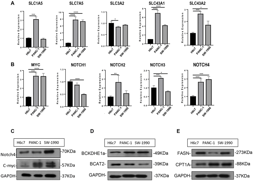 To further verify the aforementioned results, we took advantage of three distinct human pancreatic duct epithelial cell lines: the HPDE6-E6E76c7 (H6c7) cell line was immortalized from normal human pancreatic duct epithelial (HPDE) cells, PANC-1 derived from a human carcinoma of exocrine pancreas, and SW-1990 was established in 1978 from a spleen metastasis of a grade II pancreatic adenocarcinoma. SW-1990 possesses the highest degree of malignancy followed by PANC-1, while H6c7 could serve as a normal control. Regarding the BCAA transporters, SLC7A5 exhibited considerably increased expression level in both PANC-1 and SW-1990 cells. SLC1A5, SLC3A2 and SLC43A2 were mostly enriched in PANC-1 cell line, whereas SLC43A1 was slightly decreased in both PANC-1 and SW-1990 cells (Figure 4A). These results corroborated the flexibility of BCAA transporter usage, which brought challenge for therapies aimed at limiting BCAA uptake in PDAC. The similar flexibility was also observed in the upstream regulator NOTCH family proteins: as NOTCH4 was highly expressed in both PANC-1 and SW-1990 cells, NOTCH2 and NOTCH3 were highly expressed only in PANC-1 while NOTCH1 was enriched in H6c7 cell line. Contrary to the bioinformatic analysis, MYC displayed an increased expression level in both PANC-1 and SW-1990 cell lines (Figure 4B), and the enhanced expression of MYC and NOTCH4 ICD (intracellular domain) was confirmed at the protein level (Figure 4C). Consistently, the decreased BCAT2 expression indicated a diminished BCAA catabolism while the elevated CPT1A implied strengthened fatty acid oxidation; however, we were unable to detect an increase of FASN expression in PANC-1 and SW-1990 cell lines (Figure 4D–4E).