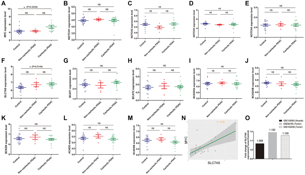 Muscle is another important place where BCAAs are produced or deposited [25, 26]. To unveil the BCAA metabolism in muscle of pancreatic cancer patients, GSE130563 dataset was additionally applied to do further investigation. We discovered that gene expression of NOTCHs does not vary between groups while MYC (5.428 ± 0.394 vs 4.333 ± 0.214, P = 0.023) expression in muscles of cachectic PDAC patients was significantly up-regulated (Figure 5A–5E). Most of the SLC transporters exhibit no change between groups, except for SLC7A5 (6.813 ± 0.638 vs 6.355 ± 0.109, P = 0.015) whose expression in muscles of cachectic PDAC patients is slightly up-regulated compared to that of normal control (Figure 5F). At the same time, BCAA catabolism related genes exhibited no significant difference (Figure 5G–5M). Correlation analysis showed that SLC7A5 expression was in moderate correlation with MYC expression in muscle of PDAC patients (r = 0.639) (Figure 5N). Since SLC7A5 is up-regulated both in PDAC tissue and muscle of PDAC patients, fold-change (relative to normal counterparts) of SLC7A5 expression in muscle and tumor was calculated to determine which one potentially acquires more BCAAs from circulation. These results indicate that the relative fold-change of SLC7A5 expression in GSE62165 (tumor) and GSE102238 (tumor) are higher than that in GSE130563 (muscle) (Figure 5O), which means PDAC tumor cells might be more capable than myocytes regarding to BCAA uptake. Thus, distinct from tumor cells, MYC instead of NOTCH is a possible upstream transcriptional regulator of SLC transporters in muscle. During PDAC cancer development, cachectic condition in particular, pancreatic tissue robustly enhance the BCAA absorptive activity with only minor change in skeletal muscles.