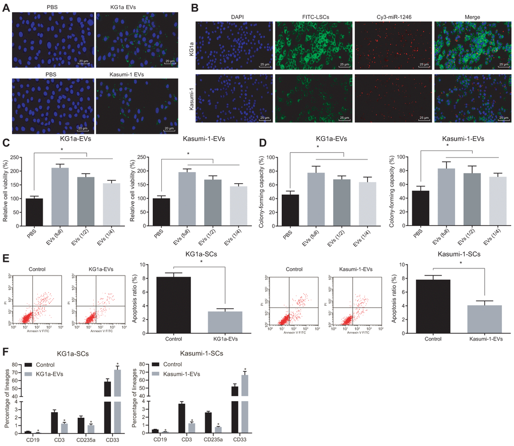 Tackling this head on, the findings in our study demonstrated that miR-1246-containing EVs from AML cells possess the ability to target LSCs and promote their survival. Similarly, miR-1246 has also been reported to potentially enhance the cell proliferation of leukemia cells by targeting the Notch2 pathway [17]. High expression of miR-1246 can also facilitate cell proliferation and migration of breast cancer [26]. miR-1246 plays a role in maintaining stem cell-like characteristics, as well as promoting the tumorigenesis, metastasis, angiogenesis, self-renewal and drug resistance of hepatocellular carcinoma [12].