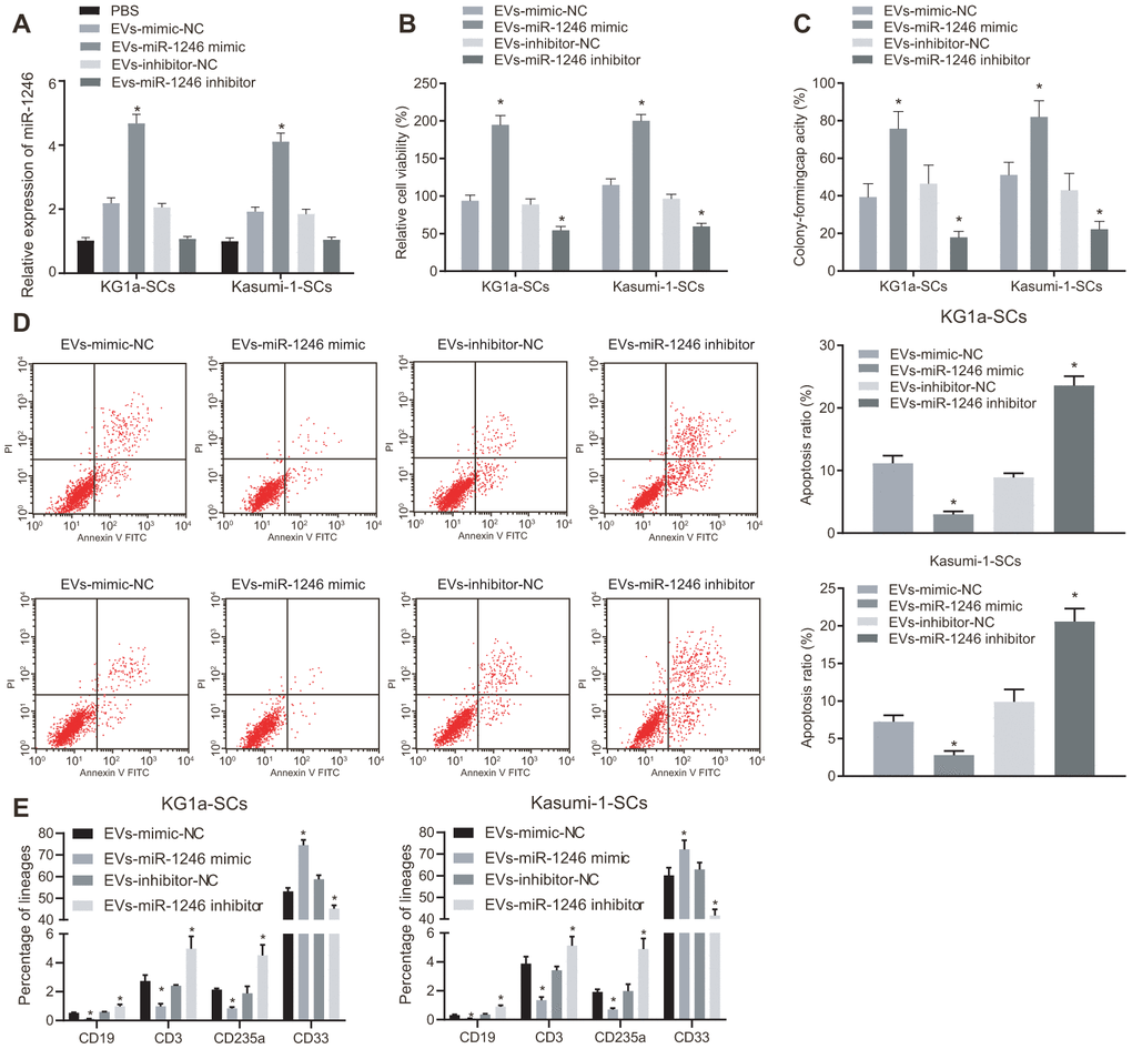 We next verified whether AML cell-derived EVs containing miR-1246 influenced the biological characteristics and differentiation potential of LSCs in vitro. EVs were isolated from AML cells with silenced or over-expressed miR-1246, and co-cultured with LSCs. Then, the role of miR-1246 expression in LSCs was evaluated. MiR-1246 expression was found to be significantly increased in LSCs co-cultured with EVs from AML cells with miR-1246 mimic (i.e. EVs-miR-1246 mimic), while being reduced in LSCs co-cultured with EVs-miR-1246 inhibitor (Figure 3A). In addition, the following assays were performed to better ascertain the effects of each EV type delivered: MTS, cell colony formation, flow cytometry and, differentiation. Cell viability and colony formation abilities were found to be notably elevated, whereas cell apoptosis and differentiation were lowered in LSCs co-cultured with EVs-miR-1246 mimic, which was opposite in LSCs co-cultured with EVs-miR-1246 inhibitor (Figure 3B–3E). To sum up, these findings indicated that miR-1246 carried by AML cell-derived EVs contributed to enhanced LSCs survival by interacting with LSCs.