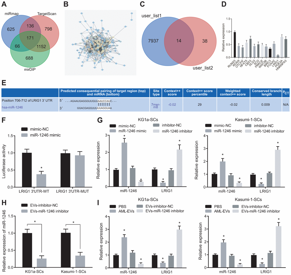 Furthermore, the putative targets of miR-1246 were screened. A total of 2077 target genes with a comprehensive mirDIP score greater than 0.15, 2261 target genes with TargetscanHuma weight comprehensive score greater than 0.02 and the top 1000 target genes in miRmap were screened, wherein 171 target genes were found to be at the intersection according to Venn diagram analysis (Figure 4A). Protein-protein interaction (PPI) analysis was then performed on these 171 genes to obtain 52 genes with more than 10 junction points (Figure 4B). In addition, 14 genes were obtained from Venn diagram analysis of the down-regulated genes of leukemia in TCGA database analyzed by online analysis website GEPIA2 and these 52 genes with junction points more than 10 (Figure 4C). LRIG1 expression patterns were found to be more significantly downregulated in KG1a cells through quantitative analysis (Figure 4D).