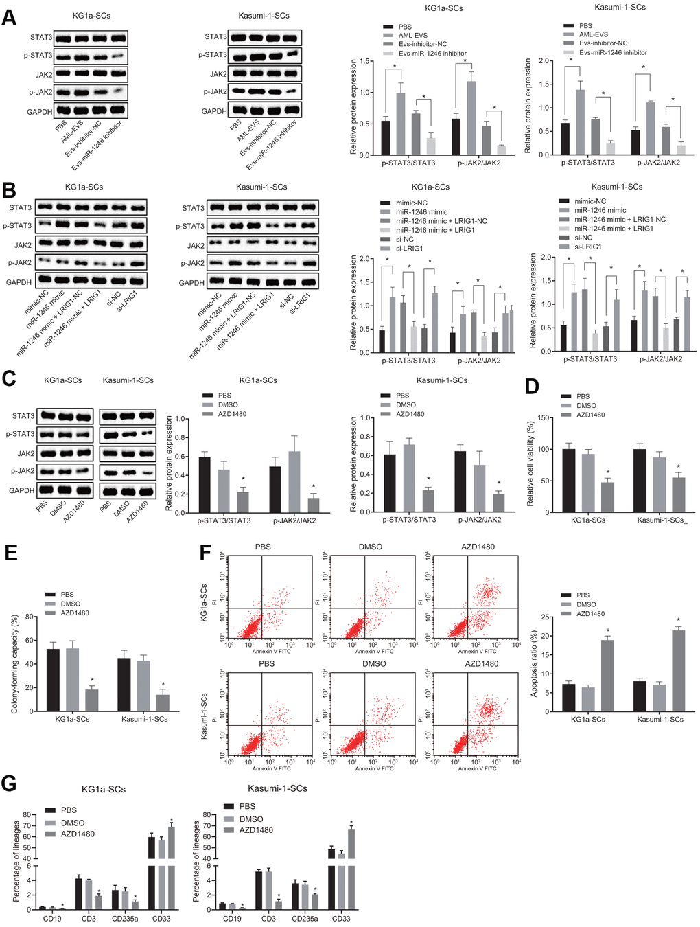 Subsequently, LSCs were treated with JAK2 inhibitor (AZD1480, 0.5 μM) in order to explore whether the STAT3 pathway was associated with the biological function and differentiation of LSCs in vitro. Firstly, the expression patterns of phosphorylated JAK2 and phosphorylated STAT3 were measured, which revealed that AZD1480 significantly down-regulated the expressions of phosphorylated JAK2 and phosphorylated STAT3 in LSCs (Figure 6C). In addition, Figure 6D, 6E illustrate that the viability and colony formation abilities of LSCs were significantly reduced, while apoptosis and differentiation were elevated after exposure to AZD1480 (Figure 6F, 6G). These results conferred that miR-1246 could indeed activate the STAT3 pathway by targeting LRIG1, thereby promoting LSCs survival and inhibiting differentiation in vitro.
