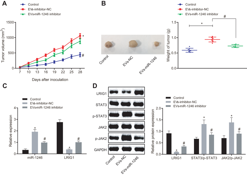 Lastly, in order to verify whether miR-1246-containing EVs from AML cells inhibited the tumor formation of LSCs in vivo, KG1a-SCs cells were subcutaneously injected into NOD/SCID mice to establish subcutaneously transplanted tumor models. Tumor formation in mice was observed and recorded in real time through subcutaneous injection with normal saline as NC, EVs-inhibitor-NC and EVs-miR-1246 inhibitor at fixed time points. As shown in Figure 7A, 7B, in comparison with normal saline injection, the injection of EVs-inhibitor-NC led to elevated tumor volume and weight. In contrast, the tumor volume and weight of mice were found to be significantly decreased after injection with the EVs-miR-1246 inhibitor compared to the EVs-inhibitor-NC injection. In addition, RNA analysis revealed a remarkable increase in the miR-1246 expression, while a significant decline in LRIG1 expression in mice receiving EVs-inhibitor-NC injection compared with normal saline-treated mice. Whereas, miR-1246 was observably down-regulated and LRIG1 was increased in mice injected with the EVs-miR-1246 inhibitor relative to those with EVs-inhibitor-NC (Figure 7C). Furthermore, Western blot analysis revealed that LRIG1 expression was impaired and the extents of JAK2 and STAT3 phosphorylation were enhanced as a consequence of EVs-inhibitor-NC injection in comparison with normal saline injection. Notably, opposite trends were evident in mice injected with the EVs-miR-1246 inhibitor versus EVs-inhibitor-NC (Figure 7D). These results suggested that the miR-1246 inhibitor delivered by AML cell-derived EVs repressed the tumorigenicity of LSCs in vivo.