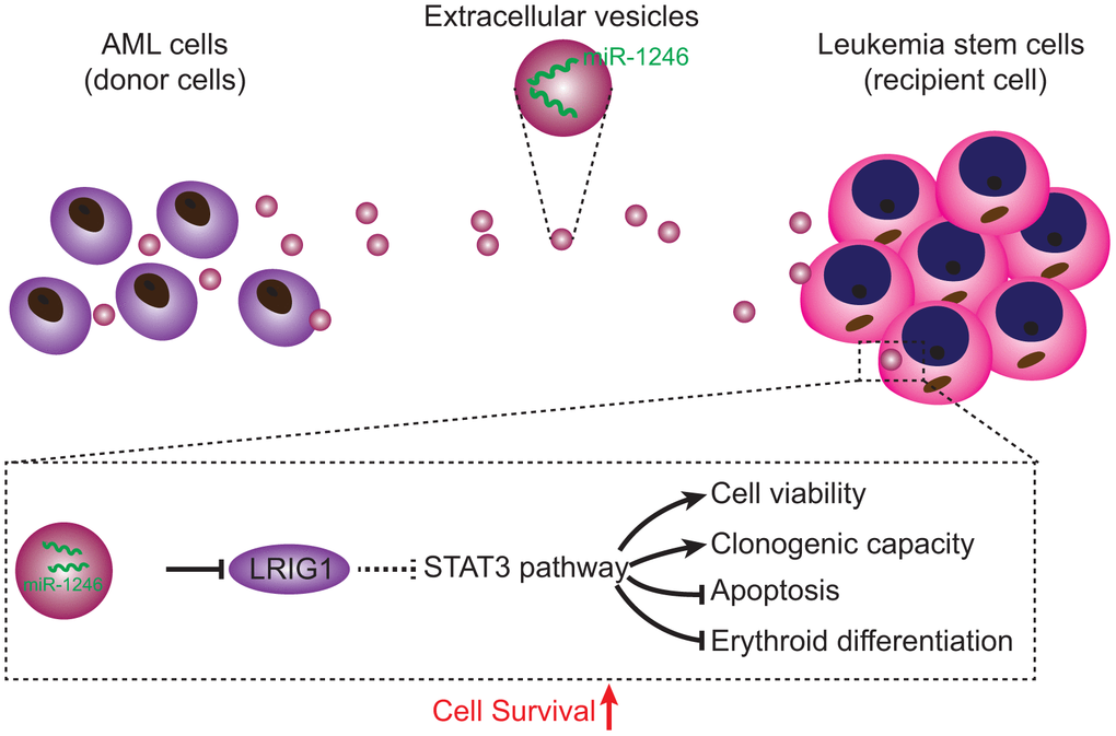 As a malignant disease of hematopoietic stem cells, AML features clonal expansion of abnormally differentiated myeloblasts [23]. EVs play a critical role in the regulation of intercellular communication and can even serve as potential vectors for delivering drugs and therapeutic genes [24]. MiRNAs-containing EVs have being developed as a new cancer diagnostic marker with complete analysis and standardized procedures [25]. The current study revealed that AML cell-derived EVs delivered miR-1246 to LSCs, thereby promoting cell viability and colony formation, and suppressing apoptosis and differentiation, which was associated with STAT3 pathway and LRIG1.