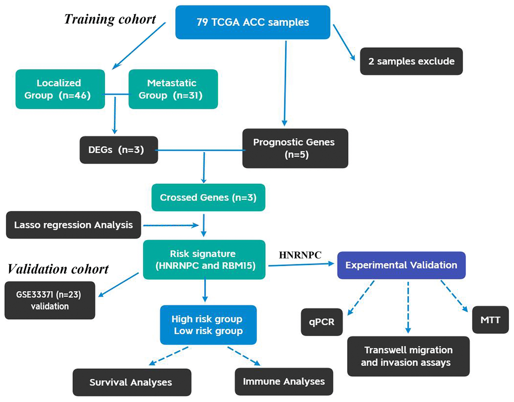 The flow chart of this study was shown in Figure 1. Using 77 ACC samples from TCGA database, an m6A-related prognostic model was constructed by the Lasso regression analysis. Then, the prognostic model was tested in validation cohort (GSE33371). The clinical characteristics of training and validation cohorts were shown in Tables 1 and 2, respectively. Further, the expression and biofunction of HNRNPC were verified by qPCR, MTT, Transwell migration and invasion assays.
