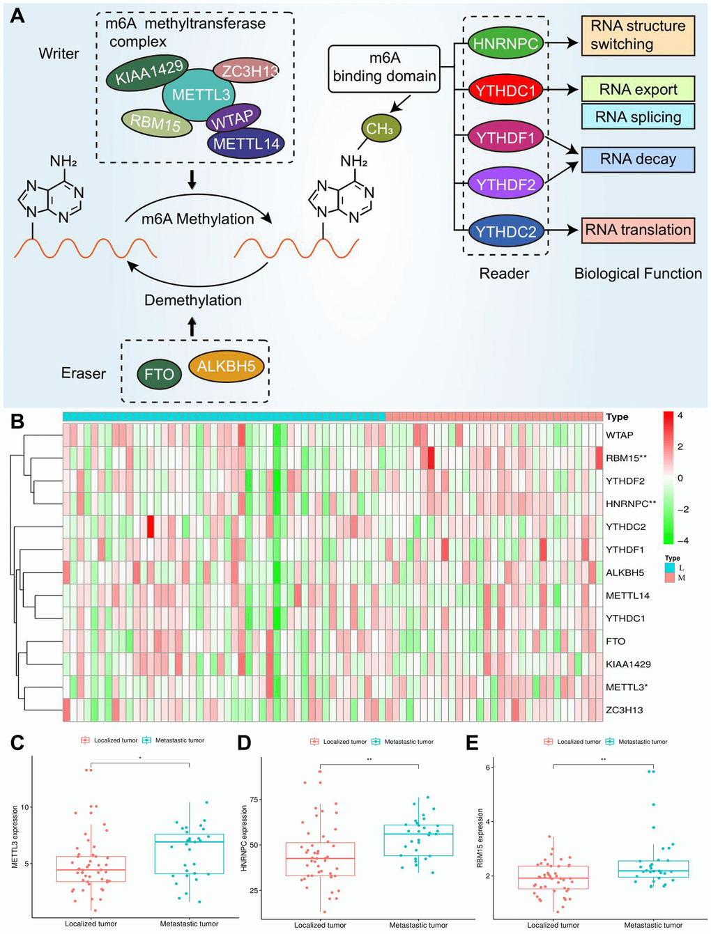 Three types of m6A regulatory genes were included in the subsequent bioinformatic analyses. The functions of these regulatory genes and the process of m6A methylation were shown in Figure 2A. A multicomponent methyltransferase complex consisting of ‘Writer’ genes is responsible for m6A methylation. METTL3 and METTL14 constitute the core portion of m6A complex, in which only METTL3 possesses the activity of methyltransferase, while, METTL14 provides a structural support for RNA binding [28]. WTAP acts as an adaptor protein to bridge METTL3 and METTL14 [29]. Besides, other ‘Writer’ genes (KIAA1429, RBM15 and ZC3H13) are proven to serve as auxiliary subunits required for m6A methylation. ‘Eraser’ genes, FTO and ALKBH5 have the ability of demethylase, therefore, which can reverse the m6A methylation [30]. All bioproducts of ‘Reader’ genes can recognize and bind to the m6A-modified sites on RNA. These genes regulate mRNA abundance through affecting RNA splicing, transport, translation and changing structural stability of RNA [28].