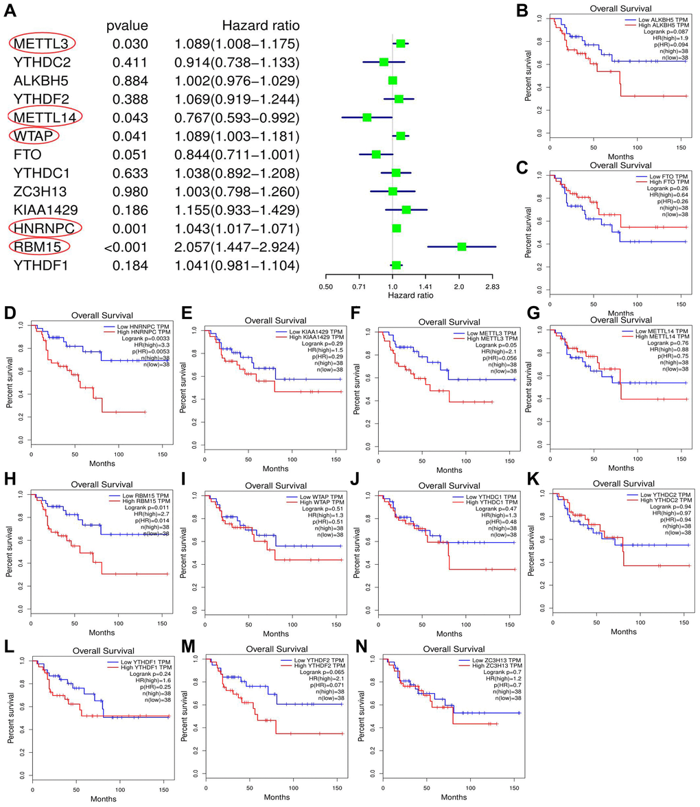 Through cox univariate analysis of TCGA data, 5 genes were proven to be related to ACC prognosis, namely METTL3 (p = 0.030, HR = 1.089), METTL14 (p = 0.043, HR = 0.767), WTAP (p = 0.041, HR = 1.089), HNRNPC (p = 0.001, HR = 1.043) and RBM15 (p < 0.001, HR = 2.057) (Figure 3A). Moreover, we reconfirmed the m6A prognostic genes via GEPIA database (Figure 3B–3N). Similar with TCGA analytical results, METTL3 (p = 0.05, HR = 2.1), HNRNPC (p = 0.0033, HR = 3.3) and RBM15 (p < 0.011, HR = 2.7) can still affect ACC survival outcomes (Figure 3D, 3F, 3H). However, the ectopic expression of METTL14 and WTAP did not bring a prognostic difference (Figure 3G–3I).