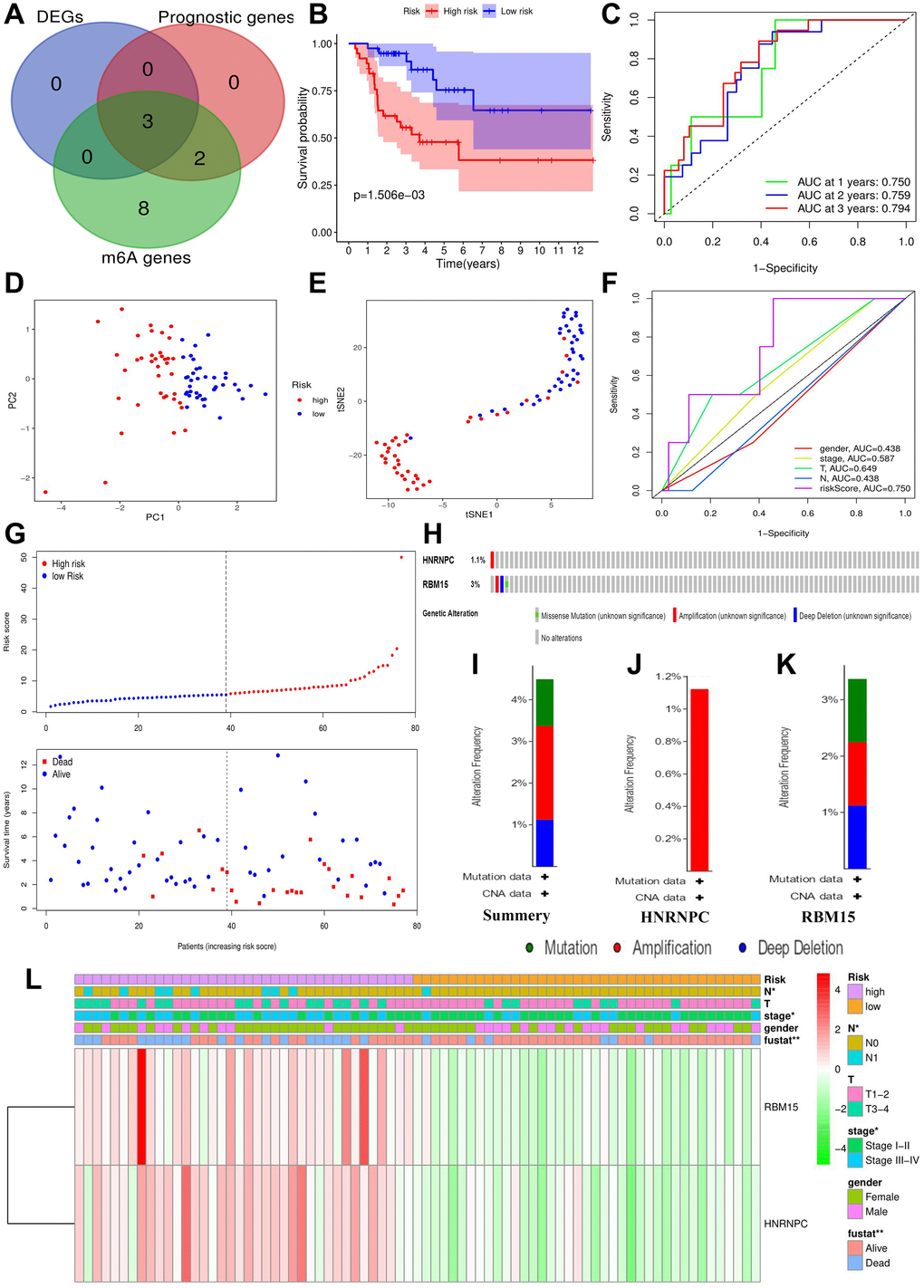 Using the cBioPortal database, only four out of 89 ACC samples (4.49%) were found to have HNRNPC and RBM15 mutations (Figure 4H). Regarding mutation type, amplification was the most predominant type for all samples (2 cases) and the only type in HNRNPC genetic alteration (Figure 4I–4K). Overall, HNRNPC and RBM15 infrequently mutated in ACC, suggesting that their aberrant expressions may result from epigenetic modification.