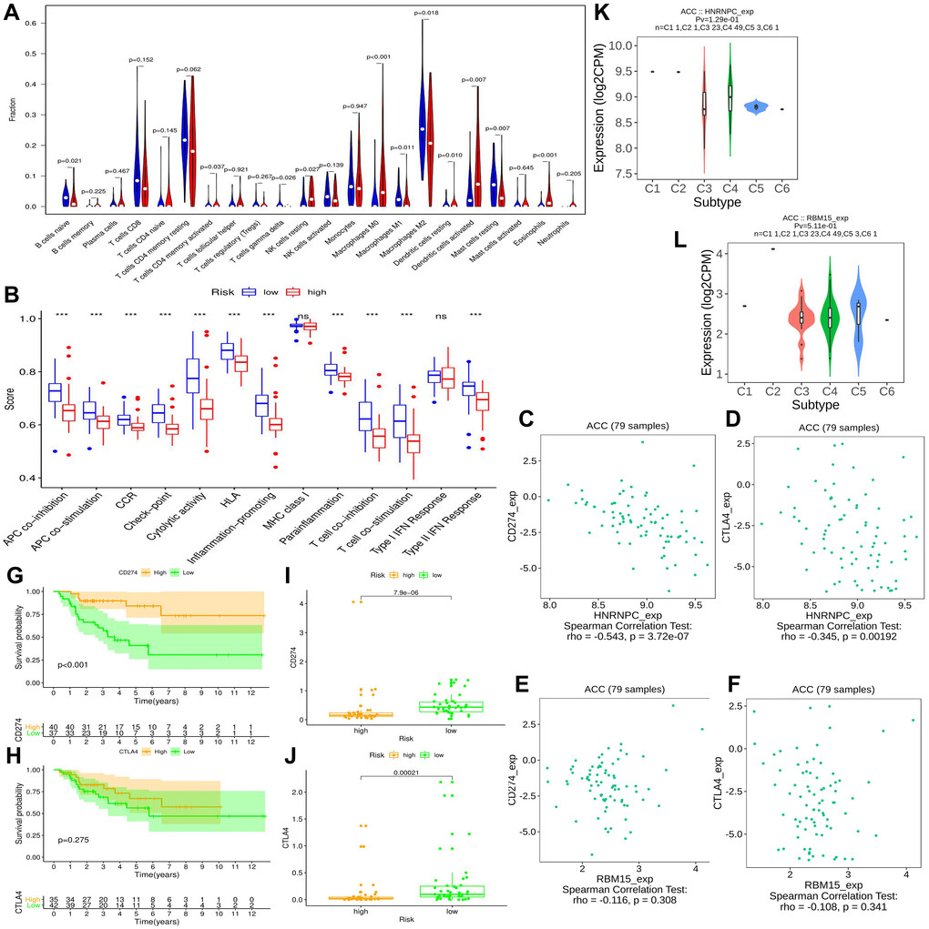 Further, we investigated the potential links between the m6A risk genes and immune checkpoint inhibitor (ICIs) therapy. The expression correlations between two cell-surface mediators (PD-L1 and CTLA4) and m6A risk genes were assessed using TISIDB online tool (http://cis.hku.hk/TISIDB/) [26]. Meanwhile, the impact of PD-L1 (CD274) and CTLA4 expressions on ACC prognosis, and their expressive difference between high- and low-risk groups were also ascertained. Besides, the distribution of HNRNPC and RBM15 expression across different immune subtypes were presented via TISIDB tool.
