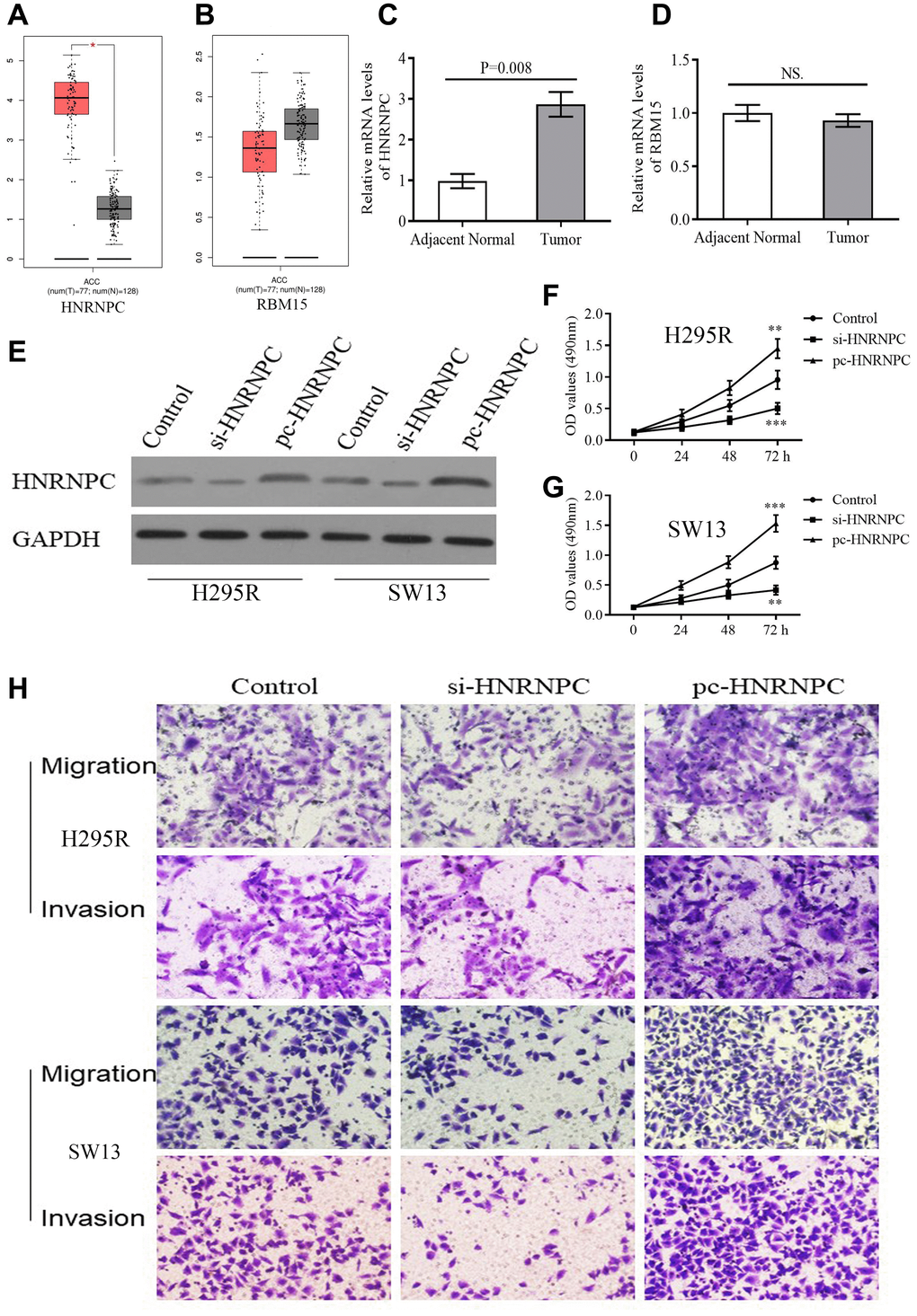 siRNAs and pcDNA 3.1 were used to alter the protein levels of HNRNPC in H295R and SW13 cells. Western blot test revealed that si-HNRNPC can effectively suppress the expression of HNRNPC and pc-HNRNPC can promote it (Figure 8E). Further, silencing HNRNPC can retard the proliferative, migrative and invasive abilities of adrenal cancer cells (Figure 8F, 8G, 8H). Conversely, overexpression of HNRNPC facilitated the proliferation, migration and invasion of adrenal cancer cells (Figure 8F, 8G, 8H). These results reiterated that HNRNPC may serve as an oncogene in ACC.