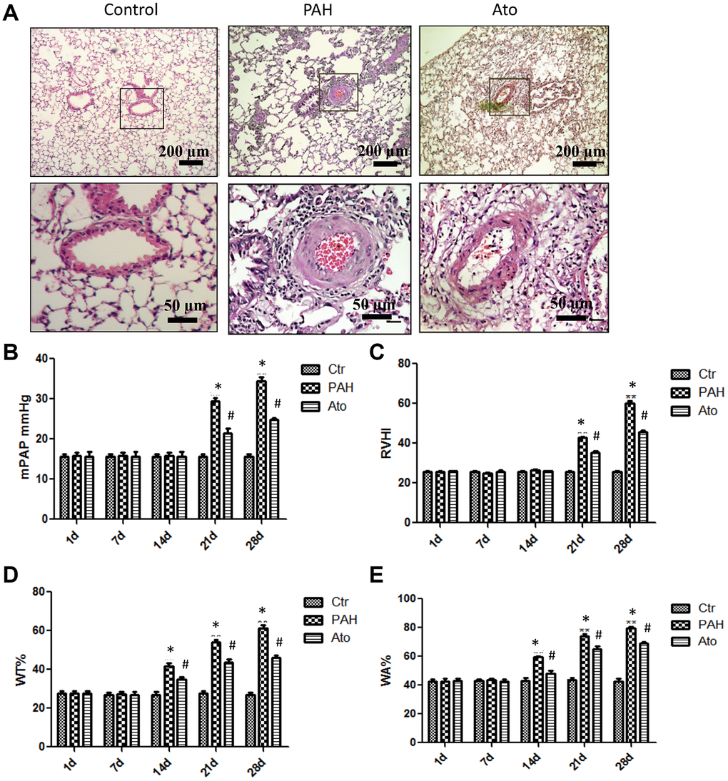 In the present study, PAH animal model was established using MCT, and found that pulmonary vascular remodeling occurred before pressure rise. After 2 weeks, WT and WA were significantly increased, which indicated that the smooth muscle cells of pulmonary arterioles in rats with pulmonary hypertension had obvious hyperplasia and hypertrophy. This could further lead to the decrease of pulmonary vascular diameter and remodeling of pulmonary arterioles. The increase of mPAP, RVHI, and resistance in pulmonary vessels confirmed that the increase of the right ventricular post load, which further resulted in the hypertrophy of the right ventricle. The above symptoms were relieved after the treatment with Ato.