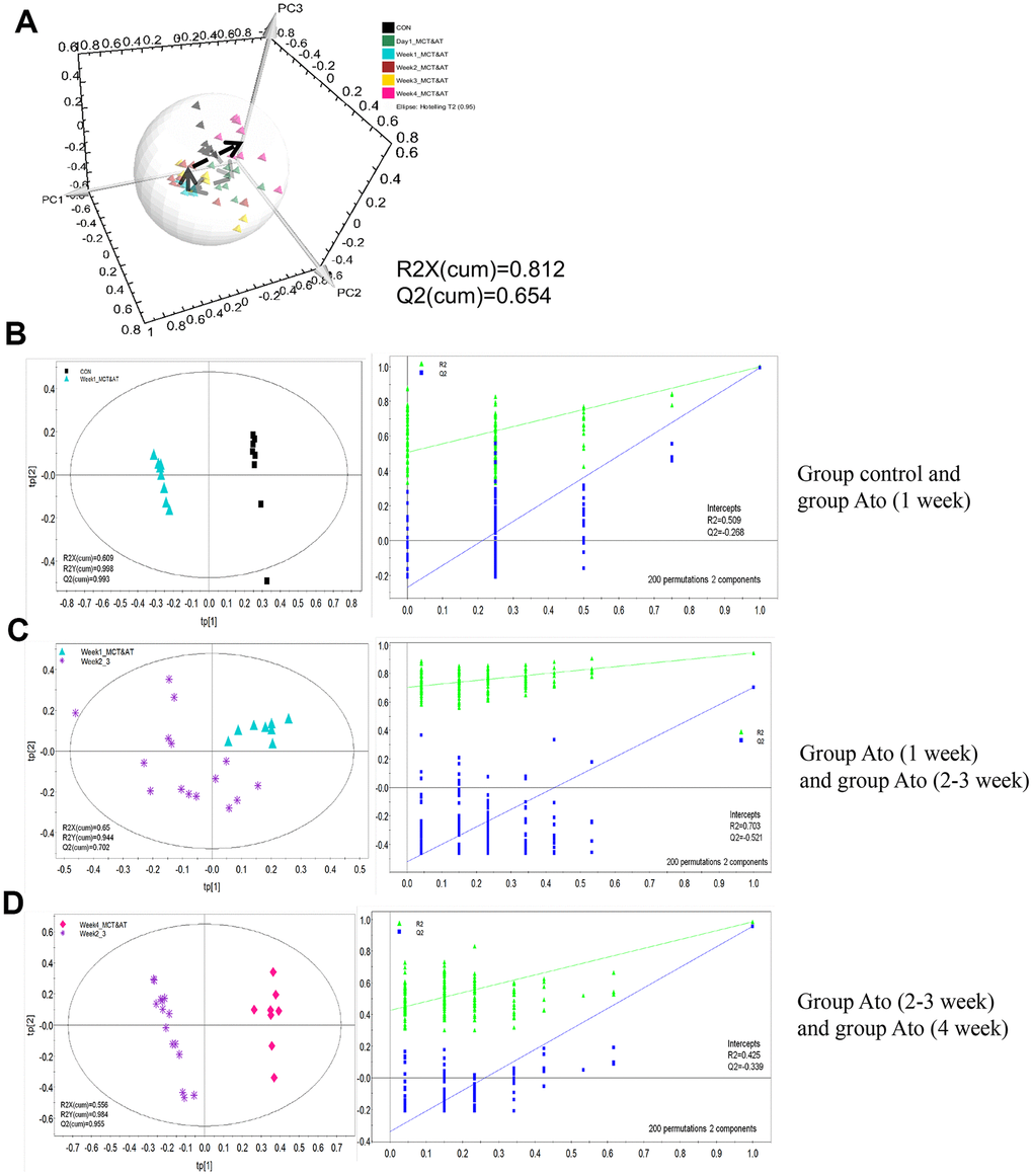 In order to investigate the influence of Ato on the metabonomics of PAH rats, PLS-DA method was conducted. The metabolic patterns of rats’ serum in different groups can be distinguished (Figure 2A). PLS-DA method was used to analyze metabonomics difference between different groups. The metabonomics differences between group control and Ato (1 week), group Ato (1 week) and Ato (2-3 week), group Ato (2-3 week) and Ato (4 week) could be distinguished (Figure 2B–2D). Meanwhile, the analysis results were verified by response sequencing (Right panels of Figure 2B–2D) indicating that PLS-DA method was effective.
