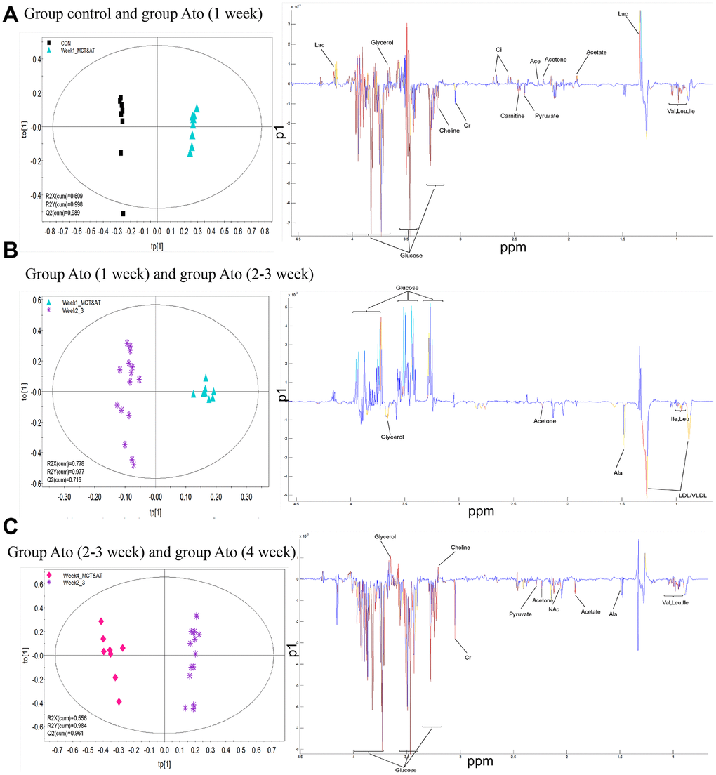 The serum metabolic patterns of group control and Ato (1 week) in the first predictive principal component (tp1) of was easily distinguished using OPLS-DA method (Left panel of Figure 3A). Variable importance in projection (VIP) and correlation coefficients (r) were performed to analyze tp1. The variables with VIP>1 and |r| exceeding the threshold were screened out (Right panel of Figure 3A), and differential metabolites were listed in the Table 1. Same method was applied to analyze differential metabolites between group Ato (1 week) and Ato (2-3 week), group Ato (2-3 week) and Ato (4 week). The differential metabolites were listed in the Tables 2, 3.