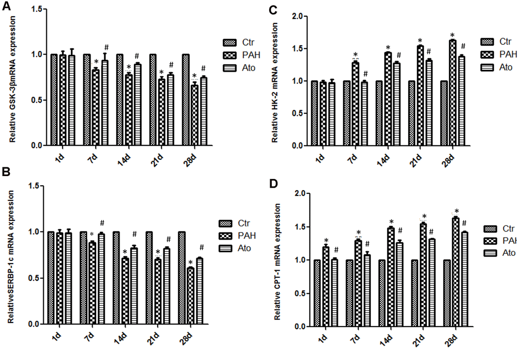 The mRNA levels of GSK-3β and SERBP-1c in group PAH were significantly decreased after 1, 2, 3, and 4 weeks (Figure 4A, 4B). However, after treatment with Ato, the decreased trend of GSK-3β and SERBP-1c was reversed markedly. On the contrary, the mRNA levels of HK-2 and CPT -1 were remarkably promoted in the group PAH, but the influence of PAH was weakened significantly by Ato (Figure 4C, 4D).