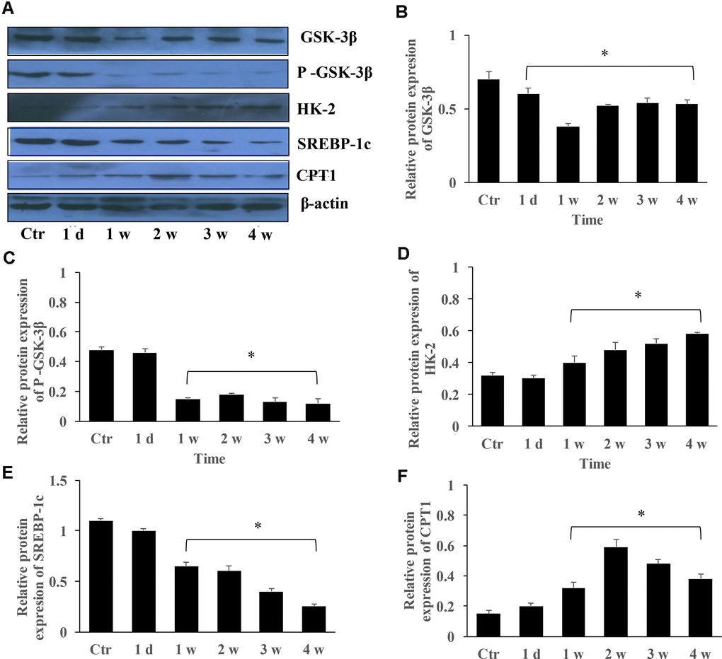 The protein expression of GSK-3β, HK-2, SERBP-1c, and CPT-1 in the group PAH at different time points were measured. The levels of GSK-3β and p-GSK-3β were markedly inhibited in the group PAH after 1, 2, 3, and 4 weeks (Figure 5A–5C). However, the protein expression of HK-2 and CPT-1 were gradually promoted (Figure 5D, 5F). Meanwhile, the level of SERBP-1c was suppressed in the MCT induced PAH animal model (Figure 5E).